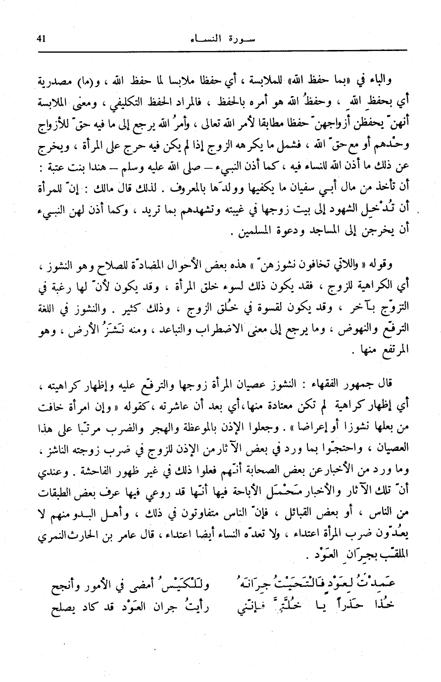 قَالَ جُمْهُورُ الْفُقَهَاءِ: النُّشُوزُ عِصْيَانُ الْمَرْأَةِ زَوْجَهَا وَالتَّرَفُّعُ عَلَيْهِ وَإِظْهَارُ كَرَاهِيَتِهِ، أَيْ إِظْهَارُ كَرَاهِيَةٍ لَمْ تَكُنْ مُعْتَادَةً مِنْهَا، أَيْ بَعْدَ أَنْ عَاشَرَتْهُ، كَقَوْلِهِ: «وَإِنِ امْرَأَةٌ خَافَتْ مِنْ بَعْلِهَا نُشُوزًا أَوْ إِعْرَاضًا» . وَجَعَلُوا الْإِذْنَ بِالْمَوْعِظَةِ وَالْهَجْرِ وَالضَّرْبِ مُرَتَّبًا عَلَى هَذَا الْعِصْيَانِ، وَاحْتَجُّوا بِمَا وَرَدَ فِي بَعْضِ الْآثَارِ مِنَ الْإِذْنِ لِلزَّوْجِ فِي ضَرْبِ زَوْجَتِهِ النَّاشِزِ، وَمَا وَرَدَ مِنَ الْأَخْبَارِ عَنْ بَعْضِ الصَّحَابَةِ أَنَّهُمْ فَعَلُوا ذَلِكَ فِي غَيْرِ ظُهُورِ الْفَاحِشَةِ. وَعِنْدِي أَنَّ تِلْكَ الْآثَارَ وَالْأَخْبَارَ مَحْمَلُ الْإِبَاحَةِ فِيهَا أَنَّهَا قَدْ رُوعِيَ فِيهَا عُرْفُ بَعْضِ الطَّبَقَاتِ مِنَ النَّاسِ، أَوْ بَعْضِ الْقَبَائِلِ، فَإِنَّ النَّاسَ مُتَفَاوِتُونَ فِي ذَلِكَ، وَأَهْلُ الْبَدْوِ مِنْهُمْ لَا يَعُدُّونَ ضَرْبَ الْمَرْأَةِ اعْتِدَاءً، وَلَا تَعُدُّهُ النِّسَاءُ أَيْضًا اعْتِدَاءً، قَالَ عَامِرُ بْنُ الْحَارِثِ النَّمِرِيُّ الْمُلَقَّبُ بِجِرَانِ الْعَوْدِ.