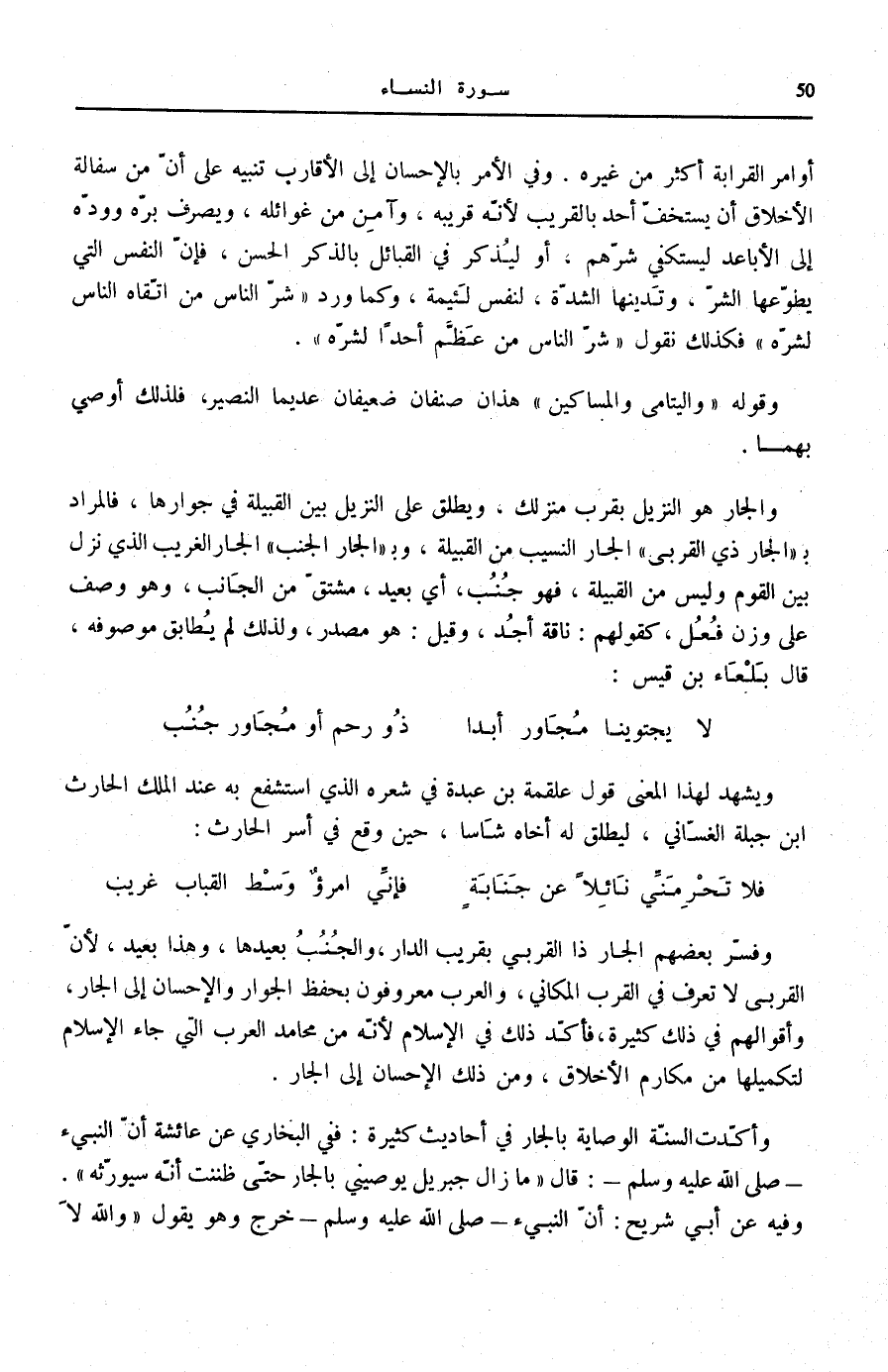 وَفَسَّرَ بَعْضُهُمُ الْجَارَ ذَا الْقُرْبَى بِقَرِيبِ الدَّارِ، وَالْجُنُبُ بِعِيدُهَا، وَهَذَا بَعِيدٌ، لِأَنَّ الْقُرْبَى لَا تُعْرَفُ فِي الْقُرْبِ الْمَكَانِيِّ، وَالْعَرَبُ مَعْرُوفُونَ بِحِفْظِ الْجِوَارِ وَالْإِحْسَانِ إِلَى الْجَارِ، وَأَقْوَالُهُمْ فِي ذَلِكَ كَثِيرَةٌ، فَأُكِدَّ ذَلِكَ فِي الْإِسْلَامِ لِأَنَّهُ مِنْ مَحَامِدِ الْعَرَبِ الَّتِي جَاءَ الْإِسْلَامُ لِتَكْمِيلِهَا مِنْ مَكَارِمِ الْأَخْلَاقِ، وَمِنْ ذَلِكَ الْإِحْسَانُ إِلَى الْجَارِ.