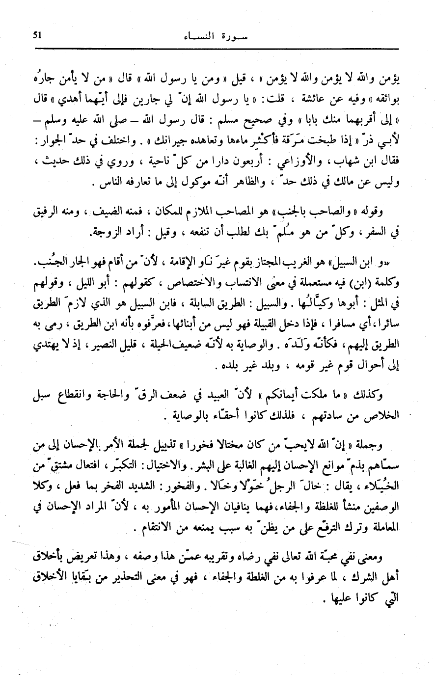 وَجُمْلَةُ: إِنَّ اللَّهَ لَا يُحِبُّ مَنْ كانَ مُخْتالًا فَخُوراً تَذْيِيلٌ لِجُمْلَةِ الْأَمْرِ بِالْإِحْسَانِ إِلَى مَنْ سَمَّاهُمْ بِذَمِّ مَوَانِعِ الْإِحْسَانِ إِلَيْهِمُ الْغَالِبَةِ عَلَى الْبَشَرِ. وَالِاخْتِيَالُ: التَّكَبُّرُ، افْتِعَالٌ مُشْتَقٌّ مِنَ الْخُيَلَاءِ، يُقَالُ: خَالَ الرَّجُلُ خَوْلًا وَخَالًا. وَالْفَخُورُ: الشَّدِيدُ الْفَخْرِ بِمَا فَعَلَ، وَكِلَا الْوَصْفَيْنِ مَنْشَأٌ لِلْغِلْظَةِ وَالْجَفَاءِ، فَهُمَا يُنَافِيَانِ الْإِحْسَانَ الْمَأْمُورَ بِهِ، لِأَنَّ الْمُرَادَ الْإِحْسَانُ فِي الْمُعَامَلَةِ وَتَرْكُ التَّرَفُّعِ عَلَى مَنْ يُظَنُّ بِهِ سَبَبٌ يَمْنَعُهُ مِنَ الِانْتِقَامِ.