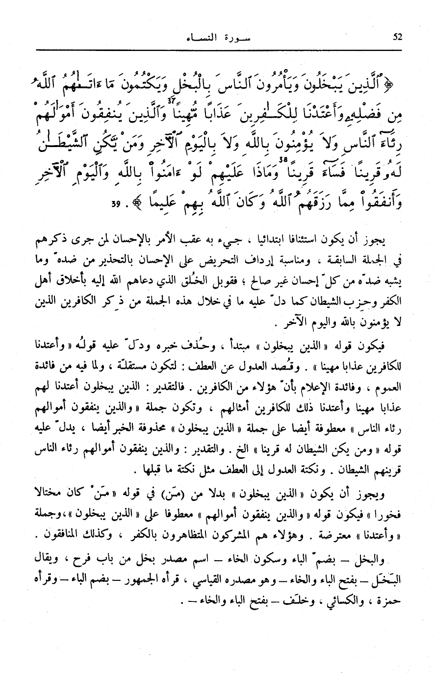 الَّذِينَ يَبْخَلُونَ وَيَأْمُرُونَ النَّاسَ بِالْبُخْلِ وَيَكْتُمُونَ مَا آتاهُمُ اللَّهُ مِنْ فَضْلِهِ وَأَعْتَدْنا لِلْكافِرِينَ عَذاباً مُهِيناً (37) وَالَّذِينَ يُنْفِقُونَ أَمْوالَهُمْ رِئاءَ النَّاسِ وَلا يُؤْمِنُونَ بِاللَّهِ وَلا بِالْيَوْمِ الْآخِرِ وَمَنْ يَكُنِ الشَّيْطانُ لَهُ قَرِيناً فَساءَ قَرِيناً (38) وَماذا عَلَيْهِمْ لَوْ آمَنُوا بِاللَّهِ وَالْيَوْمِ الْآخِرِ وَأَنْفَقُوا مِمَّا رَزَقَهُمُ اللَّهُ وَكانَ اللَّهُ بِهِمْ عَلِيماً (39)