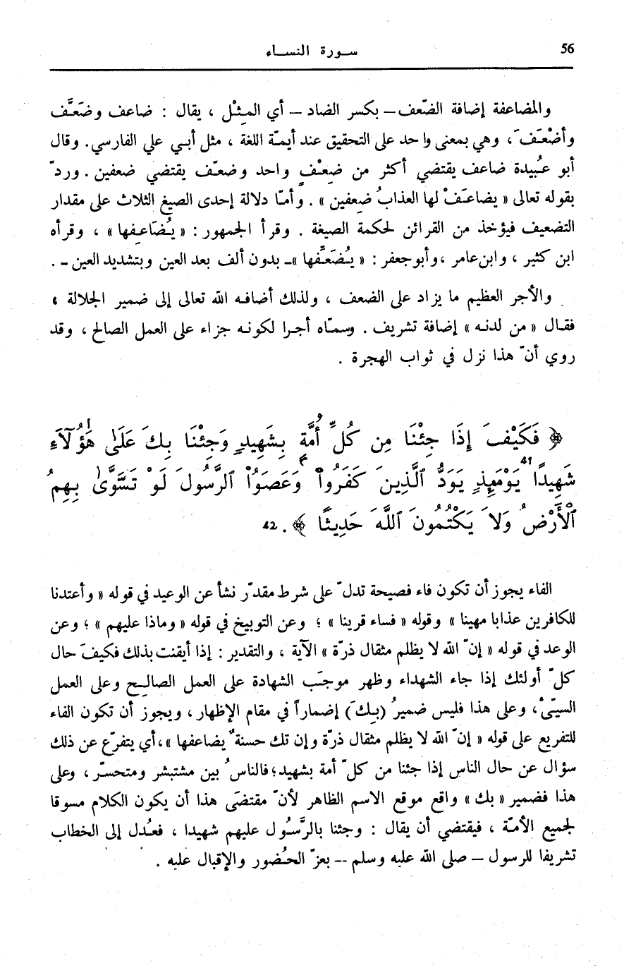 وَأَعْتَدْنا لِلْكافِرِينَ عَذاباً مُهِيناً [النِّسَاء: 37] وَقَوْلِهِ: فَساءَ قَرِيناً [النِّسَاء: 38] وَعَنِ التَّوْبِيخِ فِي قَوْلِهِ: وَماذا عَلَيْهِمْ [النِّسَاء: 39] وَعَنِ الْوَعْدِ فِي قَوْلِهِ: إِنَّ اللَّهَ لَا يَظْلِمُ مِثْقالَ ذَرَّةٍ [النِّسَاء: 40] الْآيَةَ، وَالتَّقْدِيرُ: إِذَا أَيْقَنْتَ بِذَلِكَ فَكَيْفَ حَالُ كُلِّ أُولَئِكَ إِذَا جَاءَ الشُّهَدَاءُ وَظَهَرَ مُوجَبُ الشَّهَادَةِ عَلَى الْعَمَلِ الصَّالِحِ وعَلى الْعَمَل السيّء، وَعَلَى هَذَا فَلَيْسَ ضَمِيرُ (بِكَ) إِضْمَارًا فِي مَقَامِ الْإِظْهَارِ، وَيَجُوزُ أَنْ تَكُونَ الْفَاءُ لِلتَّفْرِيعِ عَلَى قَوْلِهِ: إِنَّ اللَّهَ لَا يَظْلِمُ مِثْقالَ ذَرَّةٍ وَإِنْ تَكُ حَسَنَةً يُضاعِفْها [النِّسَاء: 40] ، أَيْ يَتَفَرَّعُ عَنْ ذَلِكَ سُؤَالٌ عَنْ حَالِ النَّاسِ إِذَا جِئْنَا مِنْ كُلِّ أُمَّةٍ بِشَهِيدٍ فَالنَّاسُ بَيْنَ مُسْتَبْشِرٍ وَمُتَحَسِّرٍ، وَعَلَى هَذَا فَضَمِيرُ بِكَ وَاقِعٌ مَوْقِعَ الِاسْمِ الظَّاهِرِ لِأَنَّ مُقْتَضَى هَذَا أَنْ يَكُونَ الْكَلَامُ مَسُوقًا لِجَمِيعِ الْأُمَّةِ، فَيَقْتَضِيَ أَنْ يُقَالَ: وَجِئْنَا بِالرَّسُولِ عَلَيْهِمْ شَهِيدًا، فَعَدَلَ إِلَى الْخِطَابِ تَشْرِيفًا لِلرَّسُولِ صَلَّى اللهُ عَلَيْهِ وَسَلَّمَ بِعِزِّ الْحُضُورِ وَالْإِقْبَالِ عَلَيْهِ.