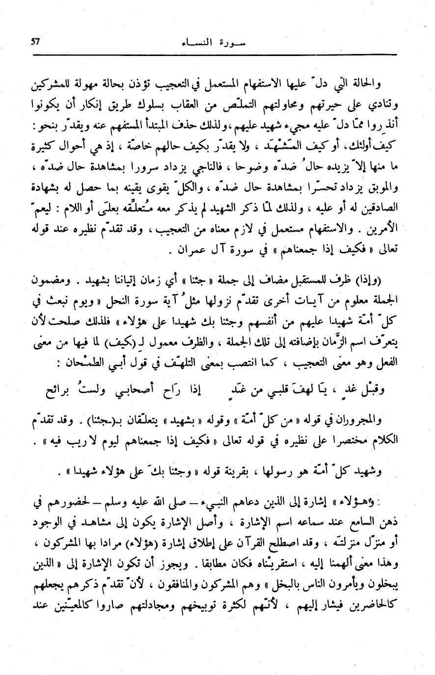 وَالْحَالَةُ الَّتِي دَلَّ عَلَيْهَا الِاسْتِفْهَامُ الْمُسْتَعْمَلُ فِي التَّعْجِيبِ تُؤْذِنُ بِحَالَةٍ مَهُولَةٍ لِلْمُشْرِكِينَ وَتُنَادِي عَلَى حَيْرَتِهِمْ وَمُحَاوَلَتِهِمُ التَّمَلُّصَ مِنَ الْعِقَابِ بِسُلُوكِ طَرِيقِ إِنْكَارِ أَنْ يَكُونُوا أُنْذِرُوا مِمَّا دَلَّ عَلَيْهِ مَجِيءُ شَهِيدٍ عَلَيْهِمْ، وَلِذَلِكَ حُذِفَ الْمُبْتَدَأُ الْمُسْتَفْهَمُ عَنْهُ وَيُقَدَّرُ بِنَحْوِ: كَيْفَ أُولَئِكَ، أَوْ كَيْفَ الْمَشْهَدُ، وَلَا يُقَدَّرُ بِكَيْفَ حَالِهِمْ خَاصَّةً، إِذْ هِيَ أَحْوَالٌ كَثِيرَةٌ مَا مِنْهَا إِلَّا يَزِيدُهُ حَالُ ضِدِّهِ وُضُوحًا، فَالنَّاجِي يَزْدَادُ سُرُورًا بِمُشَاهَدَةِ حَالِ ضِدِّهِ، وَالْمُوبَقُ يَزْدَادُ تَحَسُّرًا بِمُشَاهَدَةِ حَالِ ضِدِّهِ، وَالْكُلُّ يَقْوَى يَقِينُهُ بِمَا حَصَلَ لَهُ بِشَهَادَةِ الصَّادِقِينَ لَهُ أَوْ عَلَيْهِ، وَلِذَلِكَ لَمَّا ذَكَرَ الشَّهِيدَ لَمْ يَذْكُرْ مَعَهُ مُتَعَلِّقَهُ بِعَلَى أَوِ اللَّامِ: لِيَعُمَّ الْأَمْرَيْنِ. وَالِاسْتِفْهَامُ مُسْتَعْمَلٌ فِي لَازِمِ مَعْنَاهُ مِنَ التَّعْجِيبِ، وَقَدْ تَقَدَّمَ نَظِيرُهُ عِنْدَ قَوْلِهِ تَعَالَى: فَكَيْفَ إِذا جَمَعْناهُمْ فِي سُورَةِ آلِ عِمْرَانَ [25] .