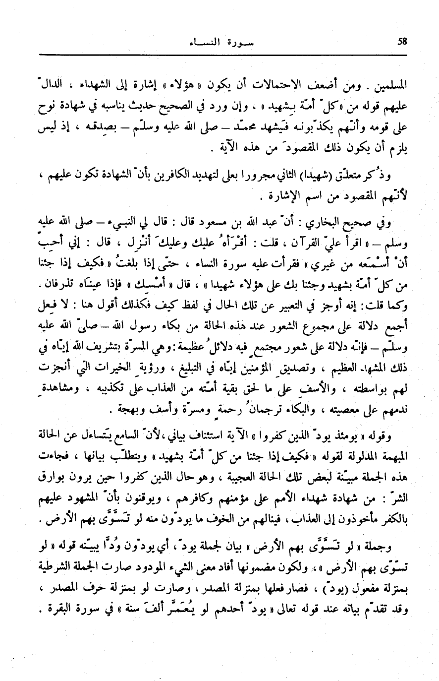 فَقَرَأْتُ عَلَيْهِ سُورَةَ النِّسَاءِ، حتّى إِذا بَلَغْتُ فَكَيْفَ إِذا جِئْنا مِنْ كُلِّ أُمَّةٍ بِشَهِيدٍ وَجِئْنا بِكَ عَلى هؤُلاءِ شَهِيداً، قَالَ: أَمْسِكْ فَإِذَا عَيْنَاهُ تَذْرِفَانِ. وَكَمَا قُلْتُ: إِنَّهُ أَوْجَزَ فِي التَّعْبِيرِ عَنْ تِلْكَ الْحَالِ فِي لَفْظِ كَيْفَ فَكَذَلِكَ أَقُولُ هُنَا: لَا فِعْلَ أَجْمَعُ دَلَالَةً عَلَى مَجْمُوعِ الشُّعُورِ عِنْدَ هَذِهِ الْحَالَةِ مِنْ بُكَاءِ رَسُولِ اللَّهِ صَلَّى اللهُ عَلَيْهِ وَسَلَّمَ فَإِنَّهُ دَلَالَةٌ عَلَى شُعُورٍ مُجْتَمِعٍ فِيهِ دَلَائِلُ عَظِيمَةٌ: وَهِيَ الْمَسَرَّةُ بِتَشْرِيفِ اللَّهِ إِيَّاهُ فِي ذَلِكَ الْمَشْهَدِ الْعَظِيمِ، وَتَصْدِيقِ الْمُؤْمِنِينَ إِيَّاهُ فِي التَّبْلِيغِ، وَرُؤْيَةِ الْخَيْرَاتِ الَّتِي أُنْجِزَتْ لَهُمْ بِوَاسِطَتِهِ، وَالْأَسَفِ عَلَى مَا لَحِقَ بَقِيَّةَ أُمَّتِهِ مِنَ الْعَذَابِ عَلَى تَكْذِيبِهِ، وَمُشَاهَدَةِ نَدَمِهِمْ عَلَى مَعْصِيَتِهِ، وَالْبُكَاءُ تُرْجُمَانُ رَحْمَةٍ وَمَسَرَّةٍ وَأَسَفٍ وَبَهْجَةٍ.