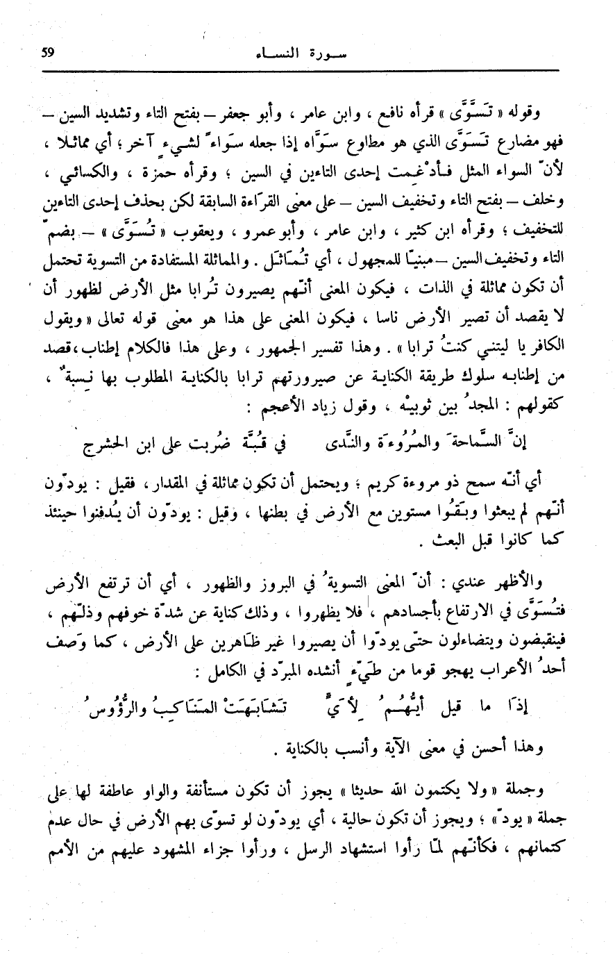 وَالْأَظْهَرُ عِنْدِي: أَنَّ الْمَعْنَى التَّسْوِيَةُ فِي الْبُرُوزِ وَالظُّهُورِ، أَيْ أَنْ تَرْتَفِعَ الْأَرْضُ فَتُسَوَّى فِي الِارْتِفَاعِ بِأَجْسَادِهِمْ، فَلَا يَظْهَرُوا، وَذَلِكَ كِنَايَةٌ عَنْ شِدَّةِ خَوْفِهِمْ وَذُلِّهِمْ، فَيَنْقَبِضُونَ وَيَتَضَاءَلُونَ حَتَّى يَوَدُّوا أَنْ يَصِيرُوا غَيْرَ ظَاهِرِينَ عَلَى الْأَرْضِ، كَمَا وَصَفَ أَحَدُ الْأَعْرَابِ يَهْجُو قوما من طيّء أَنْشَدَهُ الْمُبَرِّدُ فِي الْكَامِلِ: