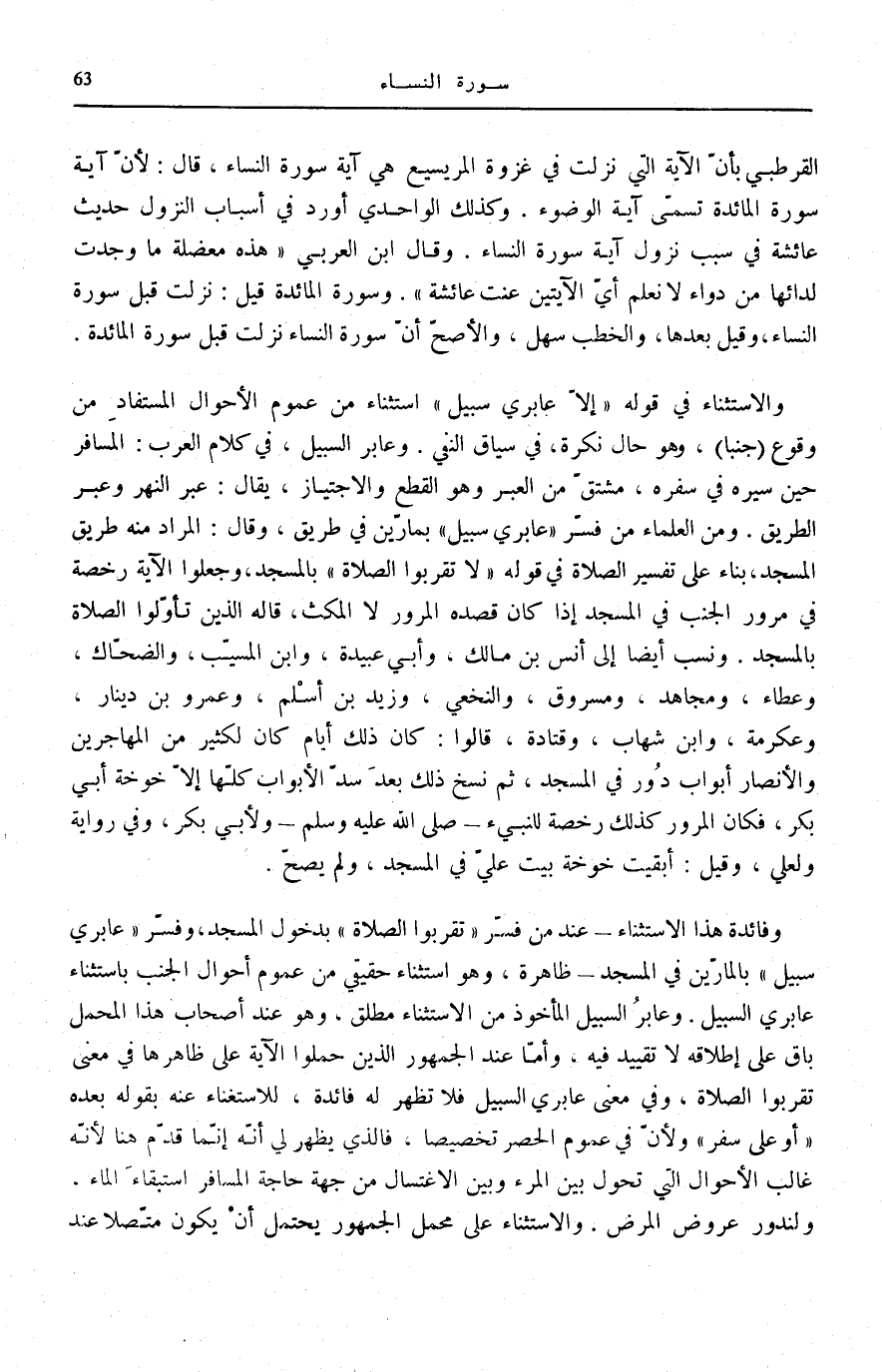 أَصْحَابِ هَذَا الْمَحْمَلِ بَاقٍ عَلَى إِطْلَاقِهِ لَا تَقْيِيدَ فِيهِ، وَأَمَّا عِنْدَ الْجُمْهُورِ الَّذِينَ حَمَلُوا الْآيَةَ عَلَى ظَاهِرِهَا فِي مَعْنَى تَقْرَبُوا الصَّلَاةَ، وَفِي مَعْنَى عَابِرِي السَّبِيلِ فَلَا تَظْهَرُ لَهُ فَائِدَةٌ، لِلِاسْتِغْنَاءِ عَنْهُ بِقَوْلِهِ بَعْدَهُ أَوْ عَلى سَفَرٍ وَلِأَنَّ فِي عُمُومِ الْحَصْرِ تَخْصِيصًا، فَالَّذِي يَظْهَرُ لِي أَنَّهُ إِنَّمَا قُدِّمَ هُنَا لِأَنَّهُ غَالِبُ الْأَحْوَالِ الَّتِي تَحُولُ بَيْنَ الْمَرْءِ وَبَيْنَ الِاغْتِسَالِ مِنْ جِهَةِ حَاجَةِ الْمُسَافِرِ اسْتِبْقَاءَ الْمَاءِ. وَلِنَدُورِ عُرُوضِ الْمَرَضِ. وَالِاسْتِثْنَاءُ عَلَى مَحْمَلِ الْجُمْهُورِ يُحْتَمَلُ أَنْ يَكُونَ مُتَّصِلًا عِنْدَ