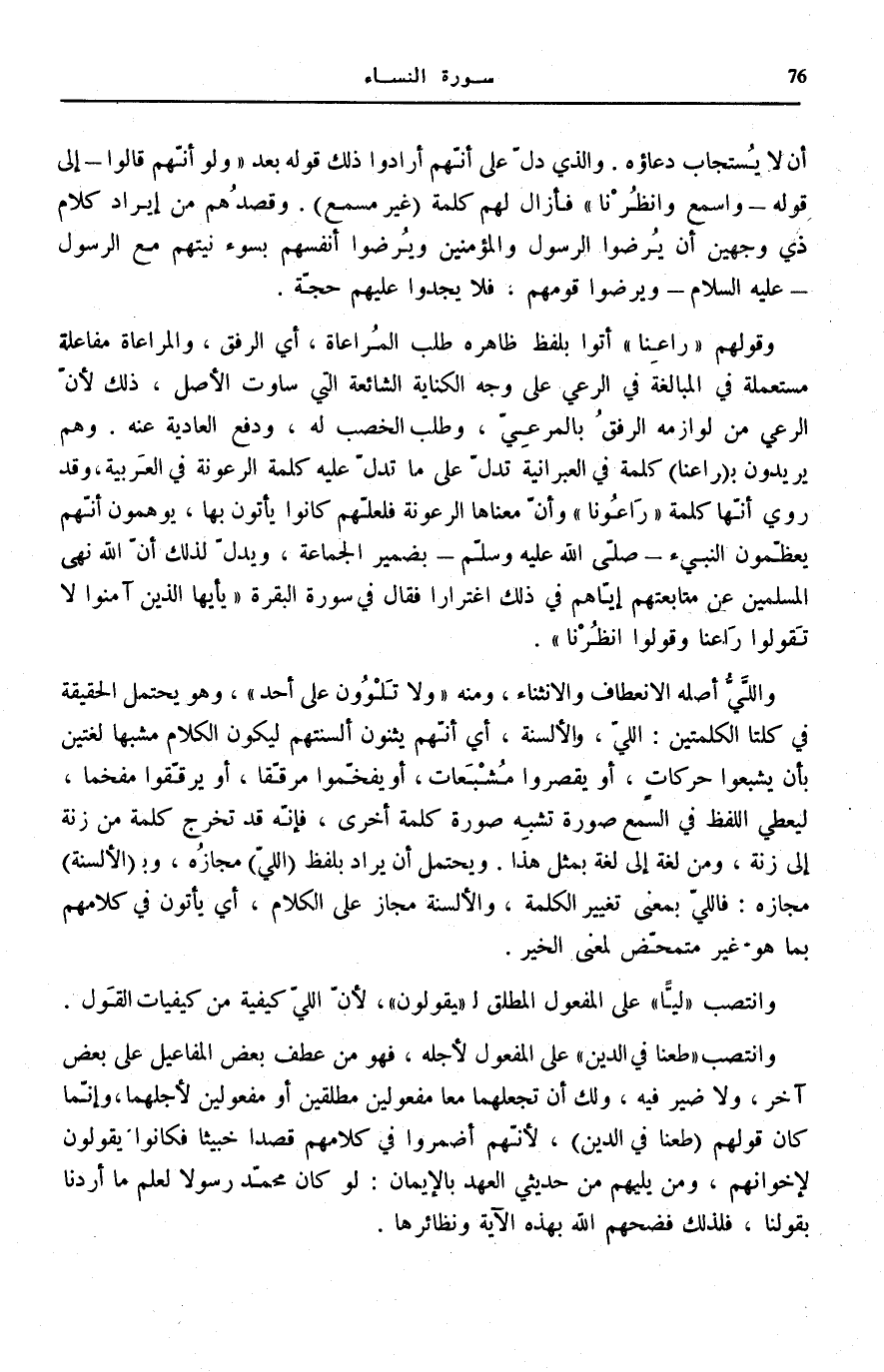 النَّبِيءَ صَلَّى اللهُ عَلَيْهِ وَسَلَّمَ بِضَمِيرِ الْجَمَاعَةِ، وَيَدُلُّ لِذَلِكَ أَنَّ اللَّهَ نَهَى الْمُسْلِمِينَ عَنْ مُتَابَعَتِهِمْ إِيَّاهُمْ فِي ذَلِكَ اغْتِرَارًا فَقَالَ فِي سُورَةِ الْبَقَرَةِ [104] : يَا أَيُّهَا الَّذِينَ آمَنُوا لَا تَقُولُوا راعِنا وَقُولُوا انْظُرْنا.