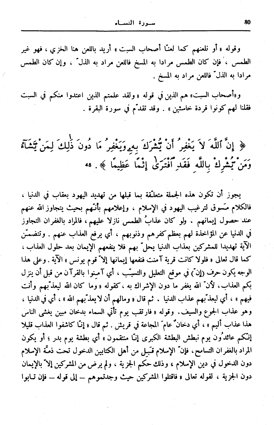 وَقَوْلُهُ: أَوْ نَلْعَنَهُمْ كَما لَعَنَّا أَصْحابَ السَّبْتِ أُرِيدَ بِاللَّعْنِ هُنَا الْخِزْيُ، فَهُوَ غَيْرُ الطَّمْسِ، فَإِنْ كَانَ الطَّمْسُ مُرَادًا بِهِ الْمَسْخُ فَاللَّعْنُ مُرَادٌ بِهِ الذُّلُّ، وَإِنْ كَانَ الطَّمْسُ مُرَادًا بِهِ الذُّلُّ فَاللَّعْنُ مُرَادٌ بِهِ الْمَسْخُ.