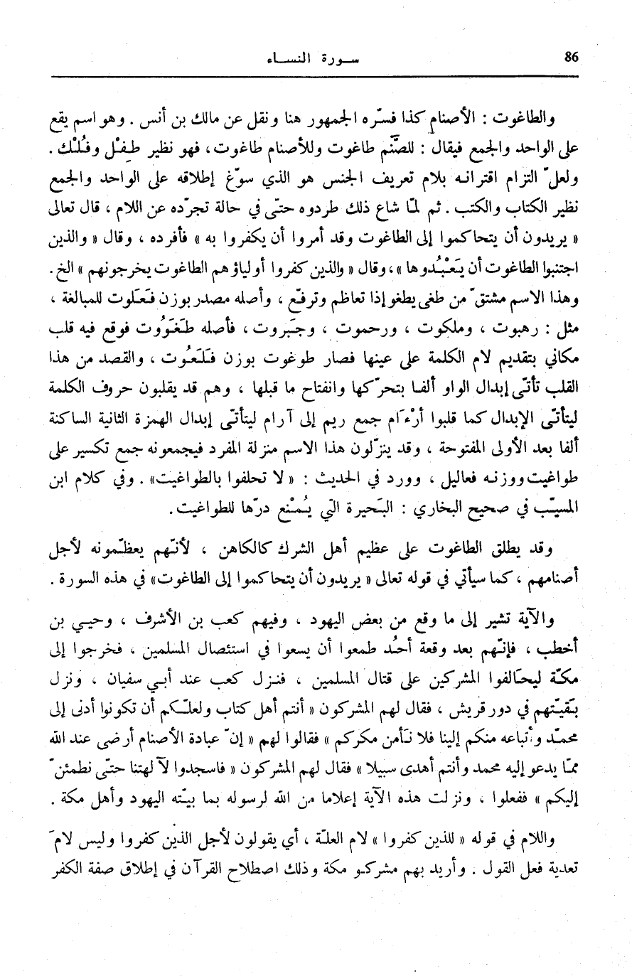 وَالطَّاغُوتُ: الْأَصْنَامُ كَذَا فَسَّرَهُ الْجُمْهُورُ هُنَا وَنُقِلَ عَنْ مَالِكِ بْنِ أَنَسٍ. وَهُوَ اسْمٌ يَقَعُ عَلَى الْوَاحِدِ وَالْجَمْعِ فَيُقَالُ: لِلصَّنَمِ طَاغُوتٌ وَلِلْأَصْنَامِ طَاغُوتٌ، فَهُوَ نَظِيرُ طِفْلٍ وَفُلْكٍ.