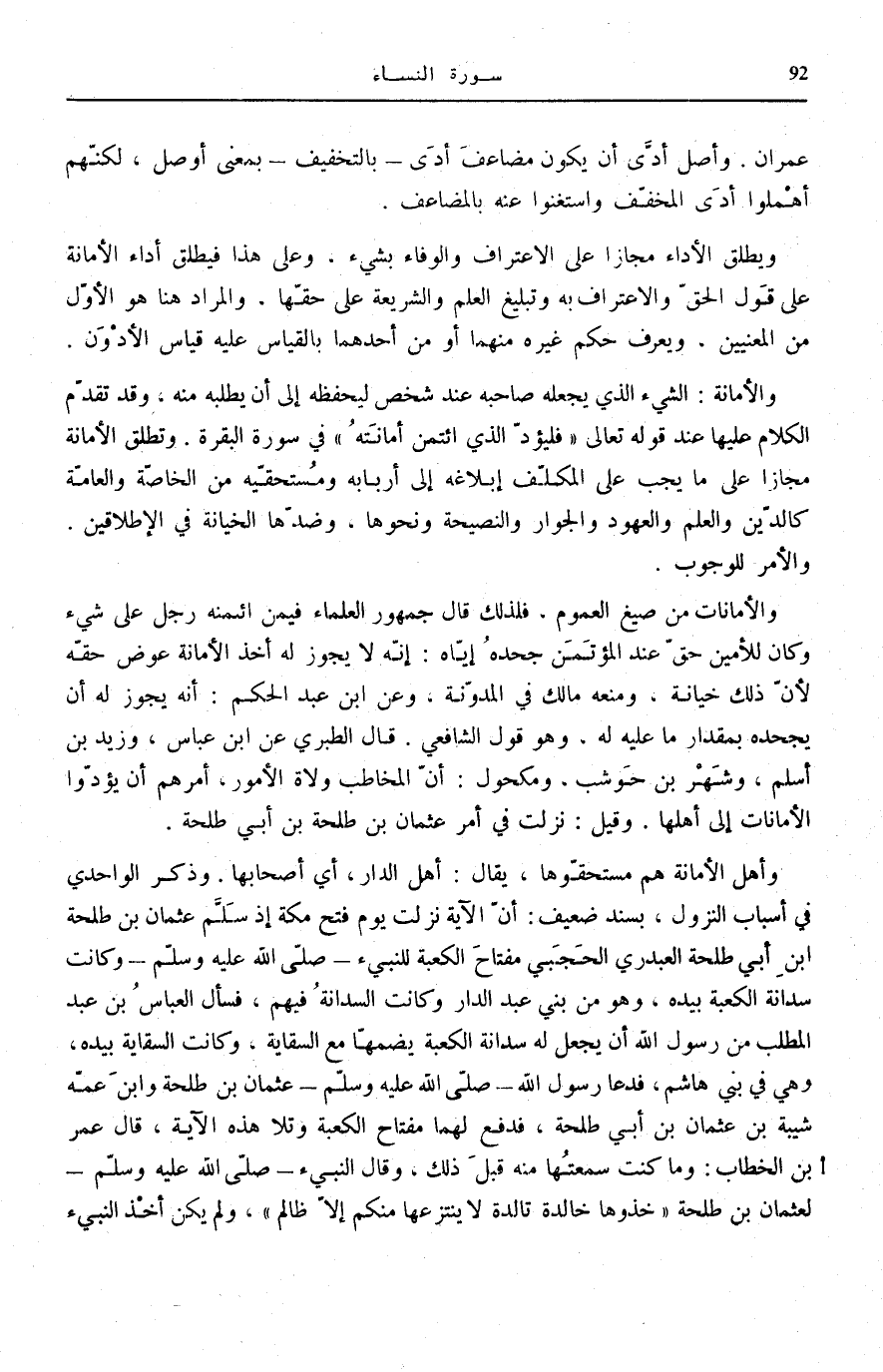 وَأَهْلُ الْأَمَانَةِ هُمْ مُسْتَحِقُّوهَا، يُقَالُ: أَهْلُ الدَّارِ، أَيْ أَصْحَابُهَا. وَذَكَرَ الْوَاحِدِيُّ فِي أَسْبَابِ النُّزُولِ، بِسَنَدٍ ضَعِيفٍ: أَنَّ الْآيَةَ نَزَلَتْ يَوْمَ فَتْحِ مَكَّةَ إِذْ سَلَّمَ عُثْمَانُ بْنُ طَلْحَةَ ابْن أَبِي طَلْحَةَ الْعَبْدَرِيُّ الْحَجَبِيُّ مِفْتَاحَ الْكَعْبَةِ لِلنَّبِيءِ صَلَّى اللهُ عَلَيْهِ وَسَلَّمَ وَكَانَتْ سِدَانَةُ الْكَعْبَةِ بِيَدِهِ، وَهُوَ مِنْ بَنِي عَبْدِ الدَّارِ وَكَانَتِ السِّدَانَةُ فِيهِمْ، فَسَأَلَ الْعَبَّاسُ بْنُ عَبَدِ الْمُطَّلِبِ مِنْ رَسُولِ اللَّهِ أَنْ يَجْعَلَ لَهُ سِدَانَةَ الْكَعْبَةِ يَضُمُّهَا مَعَ السِّقَايَةِ وَكَانَتِ السِّقَايَةُ بِيَدِهِ، وَهِيَ فِي بَنِي هَاشِمٍ، فَدَعَا رَسُولُ اللَّهِ صَلَّى اللهُ عَلَيْهِ وَسَلَّمَ عُثْمَانَ بْنَ طَلْحَةَ وَابْنَ عَمِّهِ شَيْبَةَ بْنَ عُثْمَانَ بْنِ أَبِي طَلْحَةَ، فَدَفَعَ لَهُمَا مِفْتَاحَ الْكَعْبَةِ وَتَلَا هَذِهِ الْآيَةَ، قَالَ عُمَرُ بْنُ الْخَطَّابِ: وَمَا كُنْتُ سَمِعْتُهَا مِنْهُ قَبْلَ ذَلِكَ،