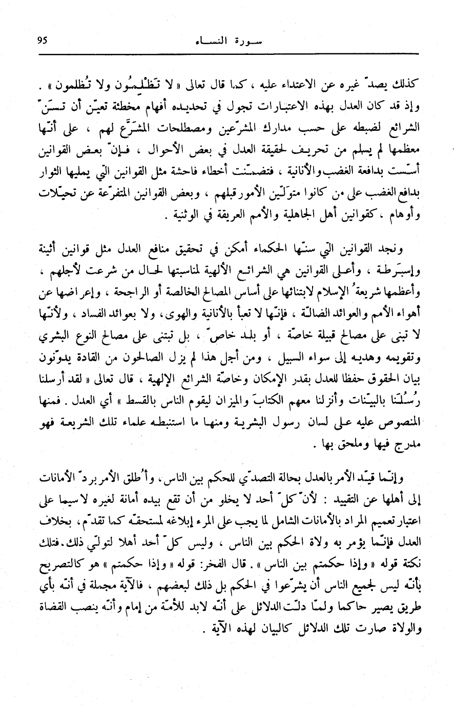 فَتِلْكَ نُكْتَةُ قَوْلِهِ: وَإِذا حَكَمْتُمْ بَيْنَ النَّاسِ. قَالَ الْفَخْرُ: قَوْلُهُ: وَإِذا حَكَمْتُمْ هُوَ كَالتَّصْرِيحِ بِأَنَّهُ لَيْسَ لِجَمِيعِ النَّاسِ أَنْ يَشْرَعُوا فِي الْحُكْمِ بَلْ ذَلِكَ لِبَعْضِهِمْ، فَالْآيَةُ مُجْمَلَةٌ فِي أَنَّهُ بِأَيِّ طَرِيقٍ يَصِيرُ حَاكِمًا وَلَمَّا دَلَّتِ الدَّلَائِلُ عَلَى أَنَّهُ لَا بُدَّ لِلْأُمَّةِ مِنْ إِمَامٍ وَأَنَّهُ يُنَصِّبُ الْقُضَاةَ وَالْوُلَاةَ صَارَت تِلْكَ الدَّلَائِل كالبيان لِهَذِهِ الْآيَةِ.