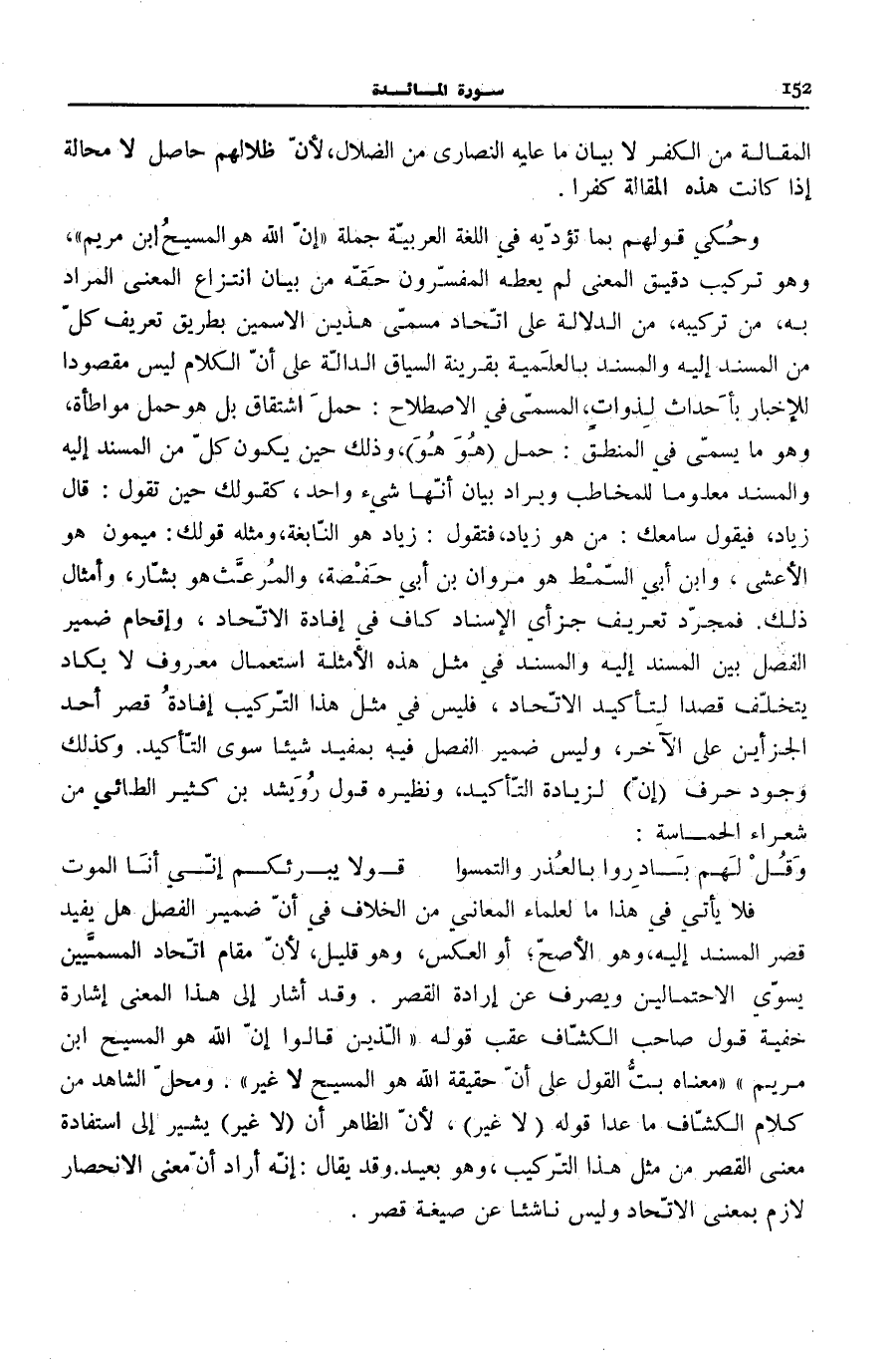 فَلَا يَأْتِي فِي هَذَا مَا لِعُلَمَاءِ الْمَعَانِي مِنَ الْخِلَافِ فِي أَنَّ ضَمِيرَ الْفَصْلِ هَلْ يُفِيدُ قَصْرَ الْمُسْنَدِ إِلَيْهِ، وَهُوَ الْأَصَحُّ أَوِ الْعَكْسَ، وَهُوَ قَلِيلٌ، لِأَنَّ مَقَامَ اتِّحَادِ الْمُسَمَّيَيْنِ يُسَوِّي الِاحْتِمَالَيْنِ وَيَصْرِفُ عَنْ إِرَادَةِ الْقَصْرِ. وَقَدْ أَشَارَ إِلَى هَذَا الْمَعْنَى إِشَارَةً خَفِيَّةً قَوْلُ صَاحِبِ «الْكَشَّافِ» عَقِبَ قَوْلِهِ: الَّذِينَ قالُوا إِنَّ اللَّهَ هُوَ الْمَسِيحُ ابْنُ مَرْيَمَ «مَعْنَاهُ بَتُّ الْقَوْلِ عَلَى أَنَّ حَقِيقَةَ اللَّهِ هُوَ الْمَسِيحُ لَا غَيْرُ» . وَمَحَلُّ الشَّاهِدِ مِنْ كَلَامِ «الْكَشَّافِ» مَا عَدَا قَوْلِهِ (لَا غَيْرُ) ، لِأَنَّ الظَّاهِرَ أَنَّ (لَا غَيْرُ) يُشِيرُ إِلَى اسْتِفَادَةِ مَعْنَى الْقَصْرِ مِنْ مِثْلِ هَذَا التَّرْكِيبِ، وَهُوَ بَعِيدٌ. وَقَدْ يُقَالُ: إِنَّهُ أَرَادَ أَنَّ مَعْنَى الِانْحِصَارِ لَازِمٌ بِمَعْنَى الِاتِّحَادِ وَلَيْسَ نَاشِئًا عَنْ صِيغَةِ قَصْرٍ.