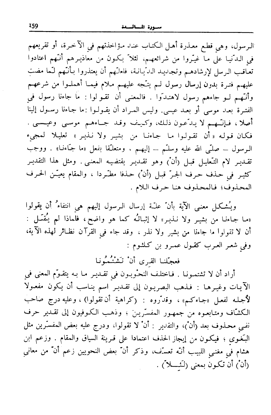وَيَشْكُلُ مَعْنَى الْآيَةِ بِأَنَّ عِلَّةَ إِرْسَالِ الرَّسُولِ إِلَيْهِمْ هِيَ انْتِفَاءُ أَنْ يَقُولُوا مَا جاءَنا مِنْ بَشِيرٍ وَلا نَذِيرٍ لَا إِثْبَاتُهُ كَمَا هُوَ وَاضح، فَلَمَّا ذَا لَمْ يَقُلْ: أَنْ لَا تَقُولُوا مَا جَاءَنَا مِنْ بشير وَلَا نذر، وَقَدْ جَاءَ فِي الْقُرْآنِ نَظَائِرُ لِهَذِهِ الْآيَةِ، وَفِي شِعْرِ الْعَرَبِ كَقَوْلِ عَمْرِو بْنِ كُلْثُومٍ: