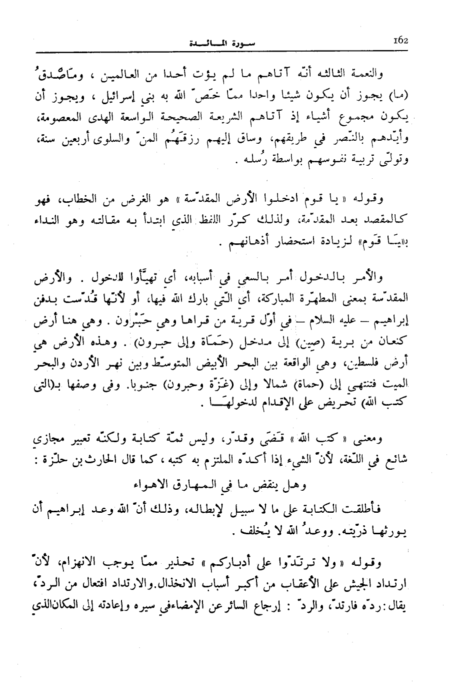 اسْتِحْضَارِ أَذْهَانِهِمْ. وَالْأَمْرُ بِالدُّخُولِ أَمْرٌ بِالسَّعْيِ فِي أَسبَابه، أَي تهيّأوا لِلدُّخُولِ. وَالْأَرْضُ الْمُقَدَّسَةُ بِمَعْنَى الْمُطَهَّرَةِ الْمُبَارَكَةِ، أَيِ الَّتِي بَارَكَ اللَّهُ فِيهَا، أَوْ لِأَنَّهَا قُدِّسَتْ بِدَفْنِ إِبْرَاهِيمَ- عَلَيْهِ السَّلَامُ- فِي أَوَّلِ قَرْيَةٍ مِنْ قُرَاهَا وَهِيَ حَبْرُونُ. وَهِيَ هُنَا أَرْضُ كَنْعَانَ مِنْ بَرِّيَّةِ (صِينَ) إِلَى مَدْخَلِ (حَمَاةَ وَإِلَى حَبْرُونَ) . وَهَذِهِ الْأَرْضُ هِيَ أَرْضُ فِلَسْطِينَ، وَهِيَ الْوَاقِعَةُ بَيْنَ الْبَحْرِ الْأَبْيَضِ الْمُتَوَسِّطِ وَبَيْنَ نَهْرِ الْأُرْدُنِّ وَالْبَحْرِ الْمَيِّتِ فَتَنْتَهِي إِلَى (حَمَاةَ) شَمَالًا وَإِلَى (غَزَّةَ وَحَبْرُونَ) جَنُوبًا. وَفِي وَصْفِهَا بِ الَّتِي كَتَبَ اللَّهُ تَحْرِيضٌ عَلَى الْإِقْدَامِ لِدُخُولِهَا.