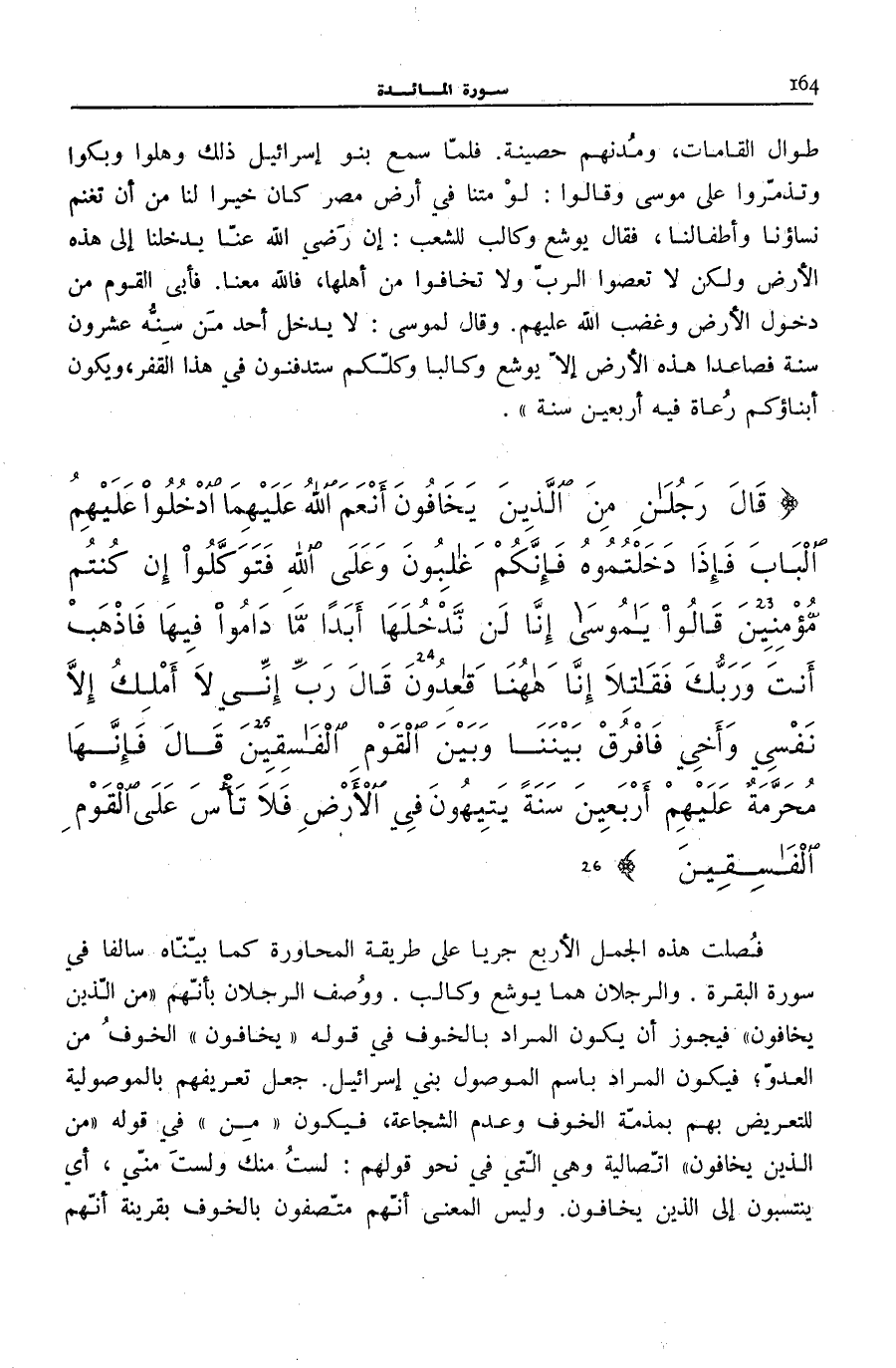 قالَ رَجُلانِ مِنَ الَّذِينَ يَخافُونَ أَنْعَمَ اللَّهُ عَلَيْهِمَا ادْخُلُوا عَلَيْهِمُ الْبابَ فَإِذا دَخَلْتُمُوهُ فَإِنَّكُمْ غالِبُونَ وَعَلَى اللَّهِ فَتَوَكَّلُوا إِنْ كُنْتُمْ مُؤْمِنِينَ (23) قالُوا يَا مُوسى إِنَّا لَنْ نَدْخُلَها أَبَداً مَا دامُوا فِيها فَاذْهَبْ أَنْتَ وَرَبُّكَ فَقاتِلا إِنَّا هاهُنا قاعِدُونَ (24) قالَ رَبِّ إِنِّي لَا أَمْلِكُ إِلاَّ نَفْسِي وَأَخِي فَافْرُقْ بَيْنَنا وَبَيْنَ الْقَوْمِ الْفاسِقِينَ (25) قالَ فَإِنَّها مُحَرَّمَةٌ عَلَيْهِمْ أَرْبَعِينَ سَنَةً يَتِيهُونَ فِي الْأَرْضِ فَلا تَأْسَ عَلَى الْقَوْمِ الْفاسِقِينَ (26)