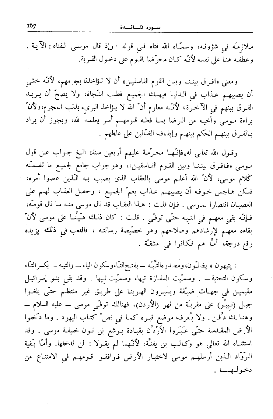 يَتِيهُونَ يَضِلُّونَ، وَمَصْدَرُهُ التَّيْهُ- بِفَتْحِ التَّاءِ وَسُكُونِ الْيَاءِ- وَالتِّيهُ- بِكَسْرِ التَّاءِ وَسُكُونِ التَّحْتِيَّةِ-. وَسُمِّيَتِ الْمَفَازَةُ تَيْهَاءَ وَسُمِّيَتْ تِيهًا. وَقَدْ بَقِيَ بَنُو إِسْرَائِيلَ مُقِيمِينَ فِي جِهَاتٍ ضَيِّقَةٍ وَيَسِيرُونَ الْهُوَيْنَا عَلَى طَرِيقٍ غَيْرِ مُنْتَظِمٍ حَتَّى بَلَغُوا جَبَلَ (نِيبُو) عَلَى مَقْرُبَةٍ مِنْ نَهْرِ (الْأُرْدُنِّ) ، فَهُنَالِكَ تُوُفِّيَ مُوسَى- عَلَيْهِ السَّلَامُ- وَهُنَالِكَ دُفِنَ. وَلَا يُعْرَفُ مَوْضِعُ قَبْرِهِ كَمَا فِي نَصِّ كِتَابِ الْيَهُودِ. وَمَا دَخَلُوا الْأَرْضَ الْمُقَدَّسَةَ حَتَّى عَبَرُوا الْأُرْدُنَّ بِقِيَادَةِ يُوشَعَ بْنِ نُونٍ خَلِيفَةِ مُوسَى. وَقَدِ اسْتَثْنَاهُ اللَّهُ تَعَالَى هُوَ وَكَالِبَ بْنَ يَفْنَةَ، لِأَنَّهُمَا لَمْ يَقُولَا: لَنْ نَدْخُلَهَا. وَأَمَّا بَقِيَّةُ الرُّوَّادِ الَّذِينَ أَرْسَلَهُمْ مُوسَى لِاخْتِبَارِ الْأَرْضِ فَوَافَقُوا قَوْمَهُمْ فِي الِامْتِنَاعِ مِنْ دُخُولِهَا.