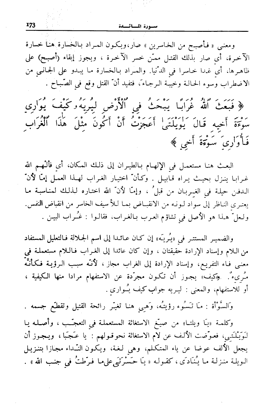 فَبَعَثَ اللَّهُ غُراباً يَبْحَثُ فِي الْأَرْضِ لِيُرِيَهُ كَيْفَ يُوارِي سَوْأَةَ أَخِيهِ قالَ يَا وَيْلَتى أَعَجَزْتُ أَنْ أَكُونَ مِثْلَ هذَا الْغُرابِ فَأُوارِيَ سَوْأَةَ أَخِي فَأَصْبَحَ مِنَ النَّادِمِينَ (31)