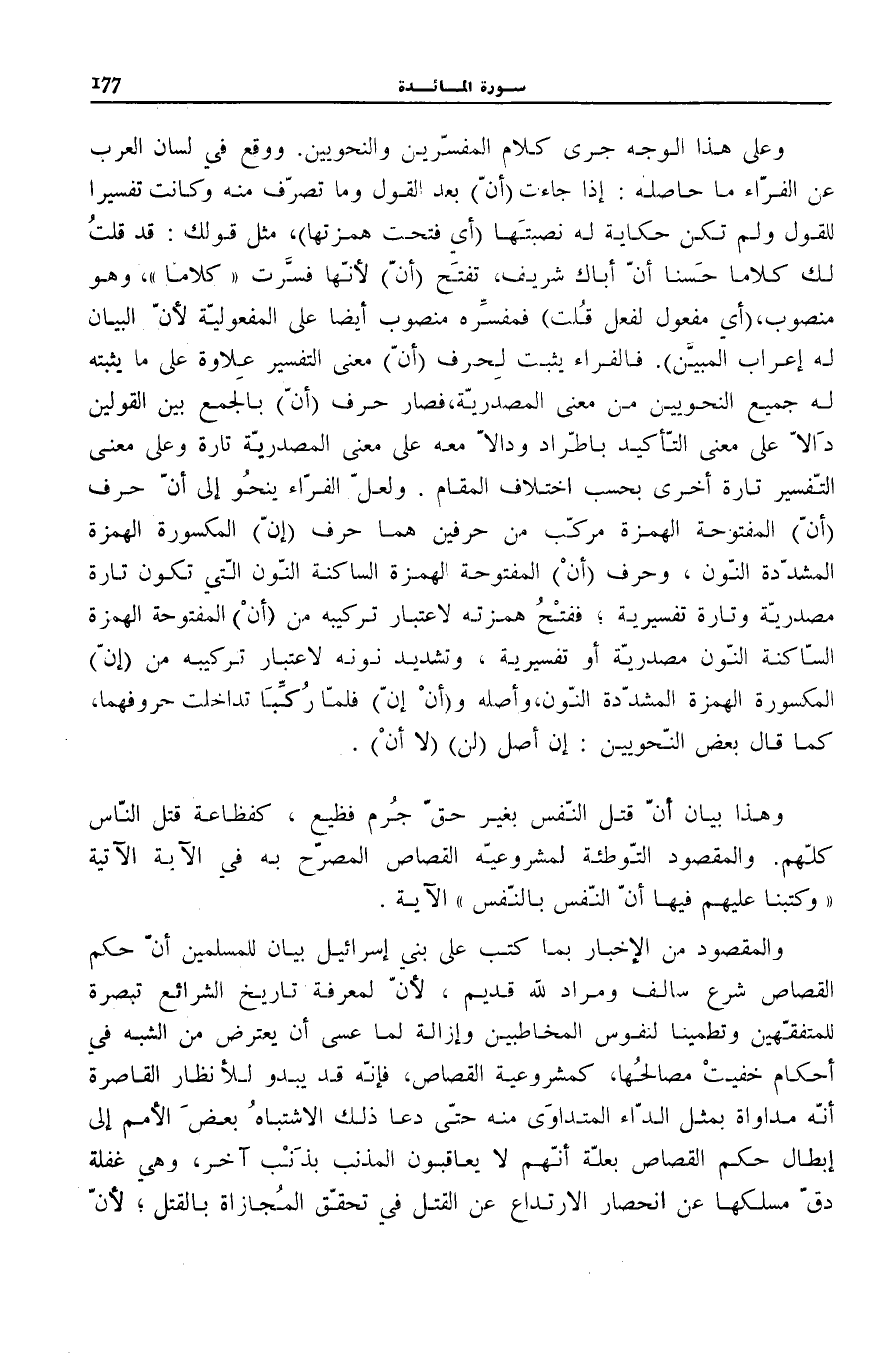وَعَلَى هَذَا الْوَجْهِ جَرَى كَلَامُ الْمُفَسِّرِينَ وَالنَّحْوِيِّينَ. وَوَقَعَ فِي «لِسَانِ الْعَرَبِ» عَنِ الْفَرَّاءِ مَا حَاصِلُهُ: إِذَا جَاءَتْ (أَنَّ) بَعْدَ الْقَوْلِ وَمَا تَصَرَّفَ مِنْهُ وَكَانَتْ تَفْسِيرًا لِلْقَوْلِ وَلَمْ تَكُنْ حِكَايَةً لَهُ نَصَبْتَهَا (أَيْ فَتَحْتَ هَمْزَتَهَا) ، مِثْلَ قَوْلِكَ: قَدْ قُلْتُ لَكَ كَلَامًا حَسَنًا أَنَّ أَبَاكَ شَرِيفٌ، تَفْتَحُ (أَنَّ) لِأَنَّهَا فَسَّرَتْ «كَلَامًا» ، وَهُوَ مَنْصُوبٌ، (أَيْ مَفْعُولٌ لِفِعْلِ قُلْتُ) فَمُفَسِّرُهُ مَنْصُوبٌ أَيْضًا عَلَى الْمَفْعُولِيَّةِ لِأَنَّ الْبَيَانَ لَهُ إِعْرَابُ الْمُبَيَّنِ. فَالْفَرَّاءُ يُثْبِتُ لِحَرْفِ (أَنَّ) مَعْنَى التَّفْسِيرِ عِلَاوَةً عَلَى مَا يُثْبِتُهُ لَهُ جَمِيعُ النَّحْوِيِّينَ مِنْ مَعْنَى الْمَصْدَرِيَّةِ، فَصَارَ حَرْفُ (أَنَّ) بِالْجَمْعِ بَيْنَ الْقَوْلَيْنِ دَالًّا عَلَى مَعْنَى التَّأْكِيدِ بِاطِّرَادٍ وَدَالًّا مَعَهُ عَلَى مَعْنَى الْمَصْدَرِيَّةِ تَارَةً وَعَلَى مَعْنَى التَّفْسِيرِ تَارَةً أُخْرَى بِحَسَبَ اخْتِلَافِ الْمَقَامِ. وَلَعَلَّ الْفَرَّاءَ يَنْحُو إِلَى أَنَّ حَرْفَ (أَنَّ) الْمَفْتُوحَةِ الْهَمْزَةِ مُرَكَّبٌ مِنْ حَرْفَيْنِ هُمَا حَرْفُ (إِنَّ) الْمَكْسُورَةِ الْهَمْزَةِ الْمُشَدَّدَةِ النُّونِ، وَحَرْفُ (أَنْ) الْمَفْتُوحَةِ الْهَمْزَةِ السَّاكِنَةِ النُّونِ الَّتِي تَكُونُ تَارَةً مَصْدَرِيَّةً وَتَارَةً تَفْسِيرِيَّةً فَفَتْحُ