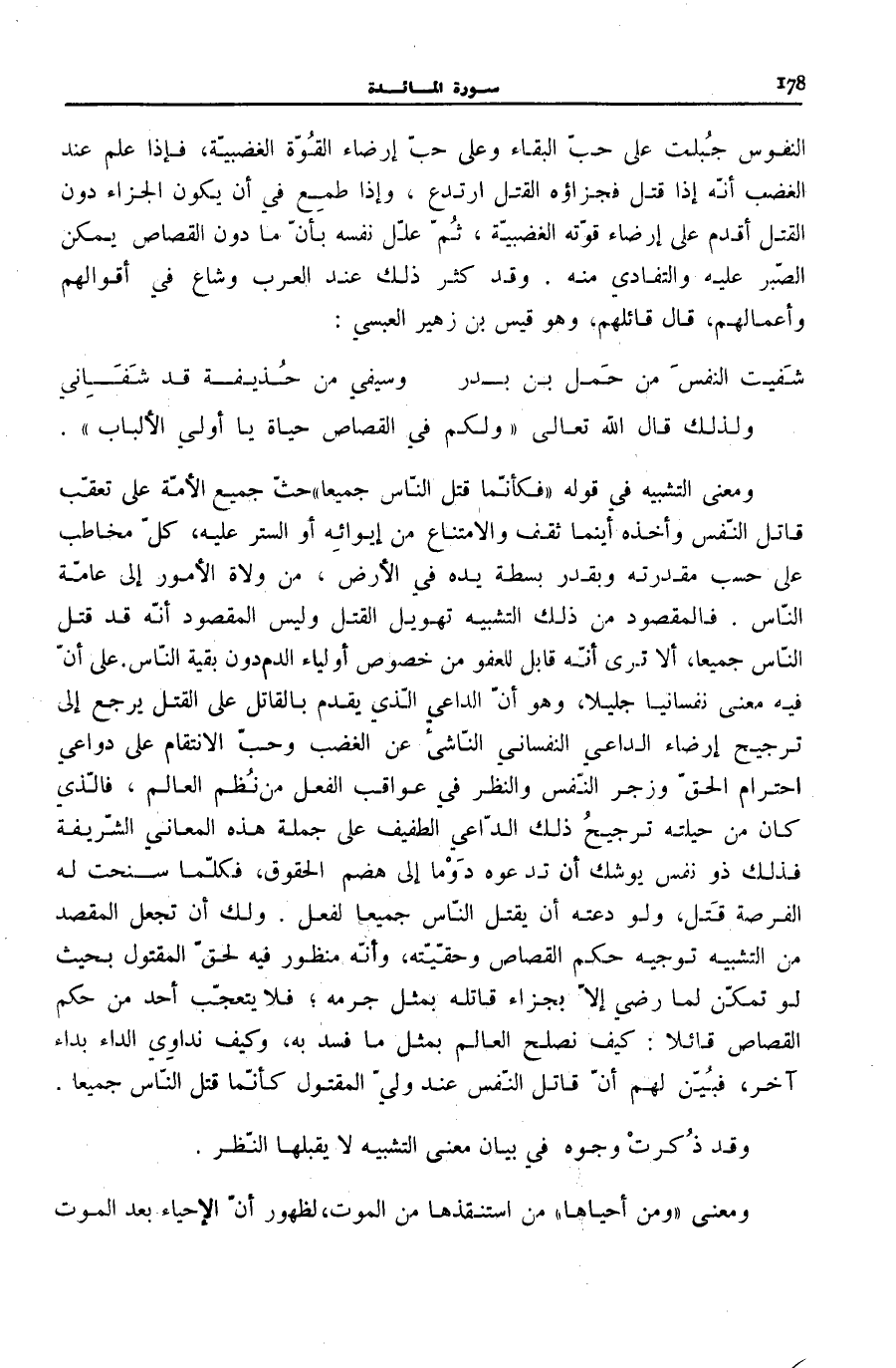 قَتَلَ، وَلَوْ دَعَتْهُ أَنْ يَقْتُلَ النَّاسَ جَمِيعًا لَفَعَلَ. وَلَكَ أَنْ تَجْعَلَ الْمَقْصِدَ مِنَ التَّشْبِيهِ تَوْجِيهَ حُكْمِ الْقِصَاصِ وَحَقِّيَّتِهِ، وَأَنَّهُ مَنْظُورٌ فِيهِ لِحَقِّ الْمَقْتُولِ بِحَيْثُ لَوْ تَمَكَّنَ لَمَا رَضِيَ إِلَّا بِجَزَاءِ قَاتِلِهِ بِمِثْلِ جُرْمِهِ فَلَا يَتَعَجَّبُ أَحَدٌ مِنْ حُكْمِ الْقِصَاصِ قَائِلًا: كَيْفَ نُصْلِحُ الْعَالَمَ بِمِثْلِ مَا فَسَدَ بِهِ، وَكَيْفَ نُدَاوِي الدَّاءَ بِدَاءٍ آخَرَ، فَبَيَّنَ لَهُمْ أَنَّ قَاتِلَ النَّفْسِ عِنْدَ وَلِيِّ الْمَقْتُولِ كَأَنَّمَا قَتَلَ النَّاسَ جَمِيعًا. وَقَدْ ذُكِرَتْ وُجُوهٌ فِي بَيَانِ مَعْنَى التَّشْبِيهِ لَا يَقْبَلُهَا النَّظَرُ.
