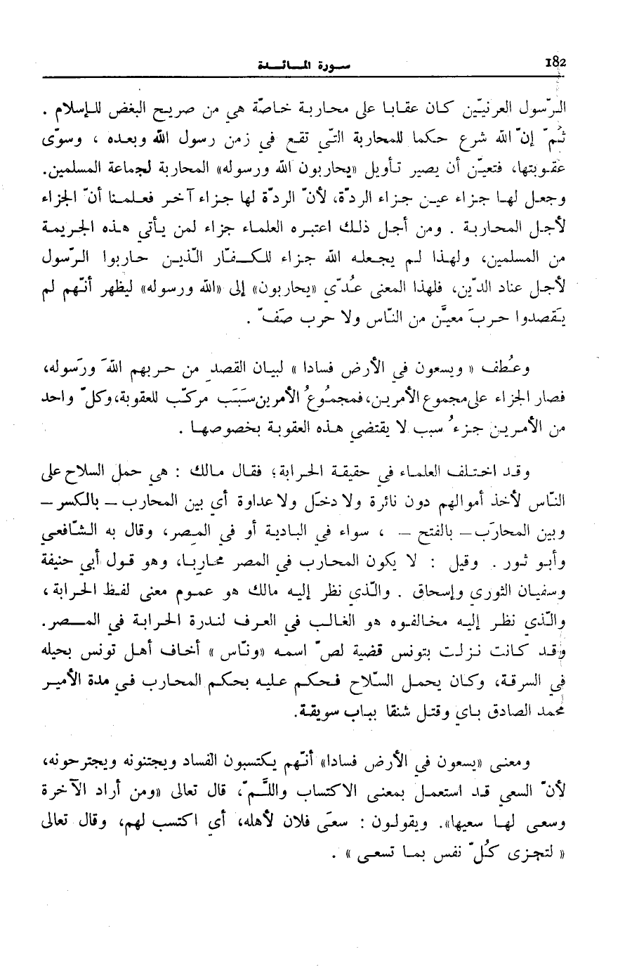 الرَّسُولُ الْعُرَنِيِّينَ كَانَ عِقَابًا عَلَى مُحَارَبَةٍ خَاصَّةٍ هِيَ مِنْ صَرِيحِ الْبُغْضِ لِلْإِسْلَامِ. ثُمَّ إِنَّ اللَّهَ شَرَعَ حُكْمًا لِلْمُحَارَبَةِ الَّتِي تَقَعُ فِي زَمَنِ رَسُولِ اللَّهِ وَبَعْدَهُ، وَسَوَّى عُقُوبَتَهَا، فَتَعَيَّنَ أَنْ يَصِيرَ تَأْوِيلُ يُحارِبُونَ اللَّهَ وَرَسُولَهُ الْمُحَارَبَةَ لِجَمَاعَةِ الْمُسْلِمِينَ. وَجُعِلَ لَهَا جَزَاءٌ عَيْنُ جَزَاءِ الرِّدَّةِ، لِأَنَّ الرِّدَّةَ لَهَا جَزَاءٌ آخَرُ فَعَلِمْنَا أَنَّ الْجَزَاءَ لِأَجْلِ الْمُحَارَبَةِ. وَمِنْ أَجْلِ ذَلِكَ اعْتَبَرَهُ الْعُلَمَاءُ جَزَاءً لِمَنْ يَأْتِي هَذِهِ الْجَرِيمَةَ مِنَ الْمُسْلِمِينَ، وَلِهَذَا لَمْ يَجْعَلْهُ اللَّهُ جَزَاءً لِلْكُفَّارِ الَّذِينَ حَارَبُوا الرَّسُولَ لِأَجْلِ عِنَادِ الدِّينِ، فَلِهَذَا الْمَعْنَى عُدِّيَ يُحارِبُونَ إِلَى اللَّهَ وَرَسُولَهُ لِيَظْهَرَ أَنَّهُمْ لَمْ يَقْصِدُوا حَرْبَ مُعَيَّنٍ مِنَ النَّاسِ وَلَا حَرْبَ صَفٍّ.