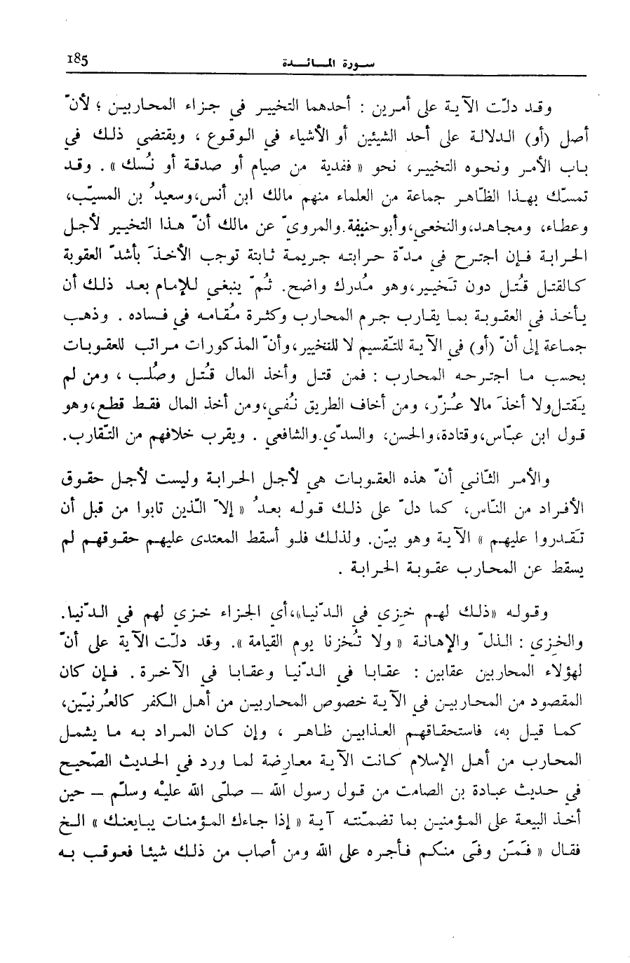 وَأَبُو حَنِيفَةَ، وَالْمَرْوِيُّ عَنْ مَالِكٍ أَنَّ هَذَا التَّخْيِيرَ لِأَجَلِ الْحِرَابَةِ، فَإِنِ اجْتَرَحَ فِي مُدَّةِ حَرَابَتِهِ جَرِيمَةً ثَابِتَةً تُوجِبُ الْأَخْذَ بِأَشَدِّ الْعُقُوبَةِ كَالْقَتْلِ قُتِلَ دُونَ تَخْيِيرٍ، وَهُوَ مُدْرَكٌ وَاضِحٌ. ثُمَّ يَنْبَغِي لِلْإِمَامِ بَعْدَ ذَلِكَ أَنْ يَأْخُذَ فِي الْعُقُوبَةِ بِمَا يُقَارِبُ جُرْمَ الْمُحَارِبِ وَكَثْرَةَ مَقَامِهِ فِي فَسَادِهِ. وَذَهَبَ جَمَاعَةٌ إِلَى أَنَّ (أَوْ) فِي الْآيَةِ لِلتَّقْسِيمِ لَا لِلتَّخْيِيرِ، وَأَنَّ الْمَذْكُورَاتِ مَرَاتِبُ لِلْعُقُوبَاتِ بِحَسْبِ مَا اجْتَرَحَهُ الْمُحَارِبُ: فَمَنْ قَتَلَ وَأَخَذَ الْمَالَ قُتِلَ وَصُلِبَ، وَمَنْ لَمْ يَقْتُلْ وَلَا أَخَذَ مَالًا عُزِّرَ، وَمَنْ أَخَافَ الطَّرِيقَ نُفِيَ، وَمَنْ أَخَذَ الْمَالَ فَقَطْ قُطِعَ، وَهُوَ قَوْلُ ابْنِ عَبَّاسٍ، وَقَتَادَةَ، وَالْحَسَنِ، وَالسُّدِّيِّ، وَالشَّافِعِيِّ. وَيَقْرُبُ خِلَافُهُمْ مِنَ التَّقَارُبِ.
