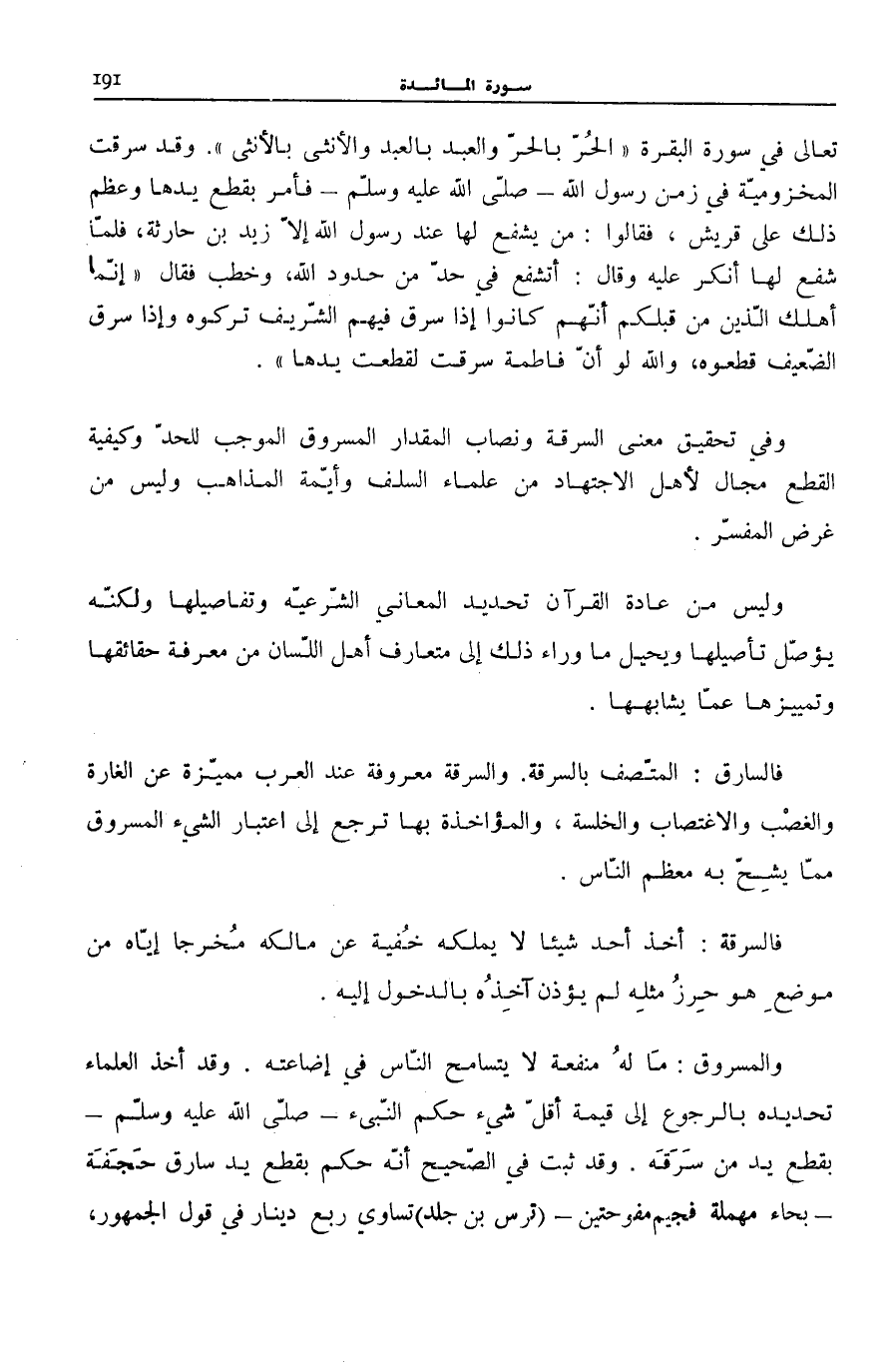 . وَفِي تَحْقِيقِ مَعْنَى السَّرِقَةِ وَنِصَابِ الْمِقْدَارِ الْمَسْرُوقِ الْمُوجِبِ لِلْحَدِّ وَكَيْفِيَّةِ الْقَطْعِ مَجَالٌ لِأَهْلِ الِاجْتِهَادِ مِنْ عُلَمَاء السّلف وأيّمة الْمَذَاهِبِ وَلَيْسَ مِنْ غَرَضِ الْمُفَسِّرِ. وَلَيْسَ مِنْ عَادَةِ الْقُرْآنِ تَحْدِيدُ الْمَعَانِي الشَّرْعِيَّةِ وَتَفَاصِيلِهَا ولكنّه يؤصّل تأوصيلها وَيُحِيلُ مَا وَرَاءَ ذَلِكَ إِلَى مُتَعَارَفِ أَهْلِ اللِّسَانِ مِنْ مَعْرِفَةِ حَقَائِقِهَا وَتَمْيِيزِهَا عَمَّا يُشَابِهُهَا.