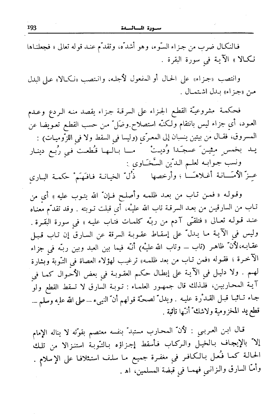 فَتَلَقَّى آدَمُ مِنْ رَبِّهِ كَلِماتٍ فَتابَ عَلَيْهِ فِي سُورَةِ الْبَقَرَةِ [37] . وَلَيْسَ فِي الْآيَةِ مَا يَدُلُّ عَلَى إِسْقَاطِ عُقُوبَةِ السَّرِقَةِ عَنِ السَّارِقِ إِنْ تَابَ قَبْلَ عِقَابِهِ، لِأَنَّ ظَاهِرَ (تَابَ- وَتَابَ اللَّهُ عَلَيْهِ) أَنَّهُ فِيمَا بَيْنَ الْعَبْدِ وَبَيْنَ رَبِّهِ فِي جَزَاءِ الْآخِرَةِ فَقَوْلُهُ: فَمَنْ تابَ مِنْ بَعْدِ ظُلْمِهِ تَرْغِيبٌ لِهَؤُلَاءِ الْعُصَاةِ فِي التَّوْبَةِ وَبِشَارةٌ لَهُمْ. وَلَا دَلِيلَ فِي الْآيَةِ عَلَى إِبْطَالِ حُكْمِ الْعُقُوبَةِ فِي بَعْضِ الْأَحْوَالِ كَمَا فِي آيَةِ الْمُحَارِبِينَ، فَلِذَلِكَ قَالَ جُمْهُورُ الْعُلَمَاءِ: تَوْبَةُ السَّارِقِ لَا تُسْقِطُ الْقَطْعَ وَلَوْ جَاءَ تَائِبًا قَبْلَ الْقُدْرَةِ عَلَيْهِ. وَيَدُلُّ لِصِحَّةِ قَوْلِهِمْ أنّ النبيء صَلَّى اللهُ عَلَيْهِ وَسَلَّمَ قَطَعَ يَدَ الْمَخْزُومِيَّةِ وَلَا شَكَّ أَنَّهَا تَائِبَةٌ.