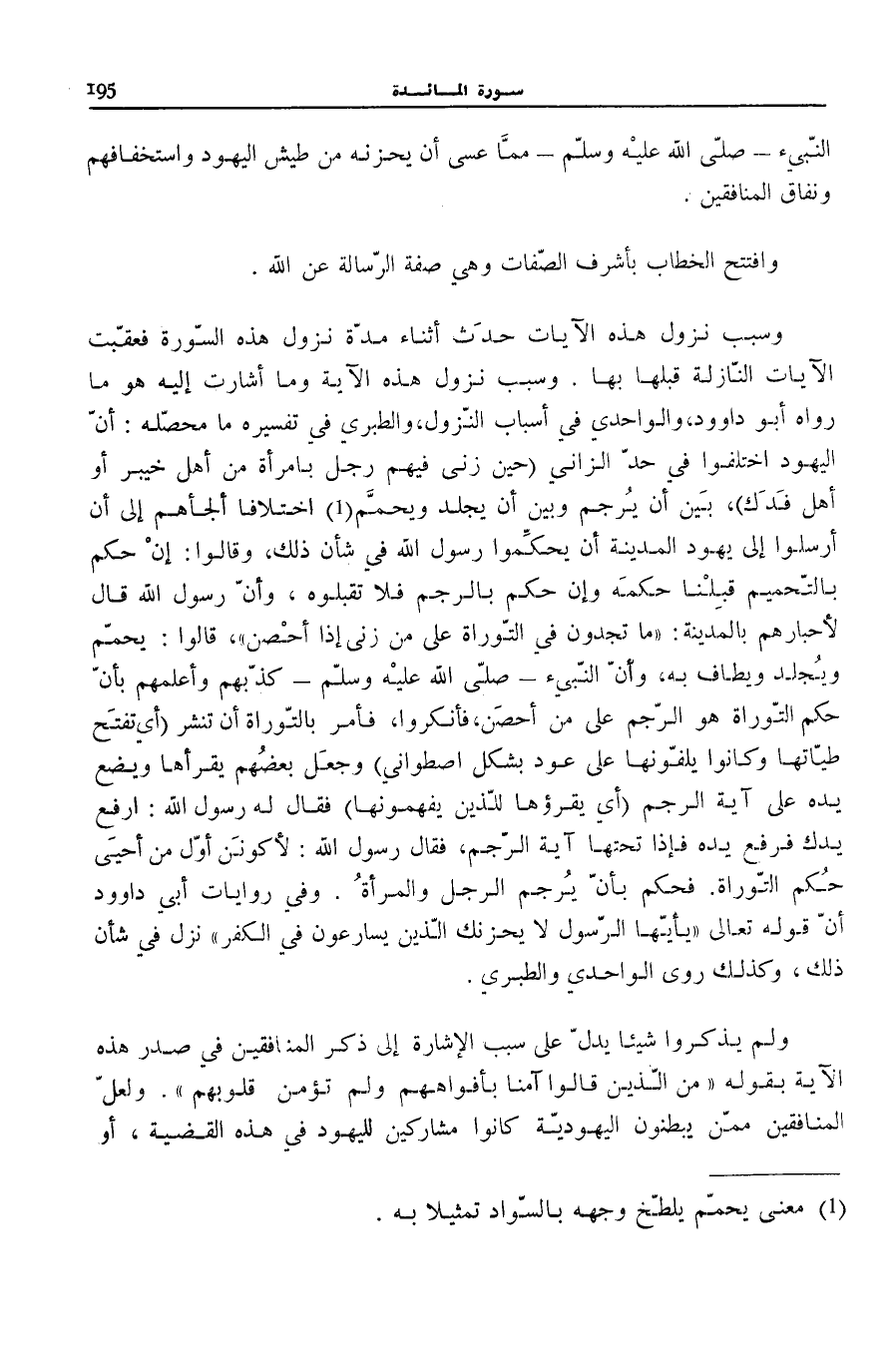 رَوَاهُ أَبُو دَاوُود، وَالْوَاحِدِيُّ فِي «أَسْبَابِ النُّزُولِ» ، وَالطَّبَرِيُّ فِي «تَفْسِيرِهِ» مَا مُحَصِّلُهُ: أَنَّ الْيَهُودَ اخْتَلَفُوا فِي حَدِّ الزَّانِي (حِينَ زَنَى فِيهِمْ رَجُلٌ بِامْرَأَةٍ مِنْ أَهْلِ خَيْبَرَ أَوْ أَهْلِ فَدَكَ) ، بَيْنَ أَنْ يُرْجَمَ وَبَيْنَ أَنْ يُجْلَدَ وَيُحَمَّمَ (¬1) اخْتِلَافًا أَلْجَأَهُمْ إِلَى أَنْ أَرْسَلُوا إِلَى يَهُودِ الْمَدِينَةِ أَنْ يُحَكِّمُوا رَسُولَ اللَّهِ فِي شَأْنِ ذَلِكَ، وَقَالُوا: إِنْ حَكَمَ بِالتَّحْمِيمِ قَبِلْنَا حُكْمَهُ وَإِنْ حَكَمَ بِالرَّجْمِ فَلَا تَقْبَلُوهُ، وَأَنَّ رَسُولَ اللَّهِ قَالَ لِأَحْبَارِهِمْ بِالْمَدِينَةِ: «مَا تَجِدُونَ فِي التَّوْرَاةِ عَلَى مَنْ زَنَى إِذَا أُحْصِنَ» ، قَالُوا: يُحَمَّمُ وَيُجْلَدُ وَيُطَافُ بِهِ، وأنّ النّبيء صَلَّى اللهُ عَلَيْهِ وَسَلَّمَ كَذَّبَهُمْ وَأَعْلَمَهُمْ بِأَنَّ حُكْمَ التَّوْرَاةِ هُوَ الرَّجْمُ عَلَى مَنْ أُحْصِنَ، فَأَنْكَرُوا، فَأَمَرَ بِالتَّوْرَاةِ أَنْ تُنْشَرَ (أَيْ تُفْتَحَ طَيَّاتُهَا وَكَانُوا يَلُفُّونَهَا عَلَى عود بشكل اصطواني) وَجعل بَعضهم يَقْرَأها وَيَضَعُ يَدَهُ عَلَى آيَةِ الرَّجْمِ (أَيْ يَقْرَؤُهَا لِلَّذِينَ يَفْهَمُونَهَا) فَقَالَ لَهُ رَسُولُ اللَّهِ: ارْفَعْ يَدَكَ فَرَفَعَ يَدَهُ فَإِذَا تَحْتَهَا آيَةُ الرَّجْمِ، فَقَالَ رَسُولُ اللَّهِ: «لَأَكُونَنَّ أوّل من أحيى حُكْمَ التَّوْرَاةِ» . فَحَكَمَ بِأَنْ يُرْجَمَ الرَّجُلُ وَالْمَرْأَةُ