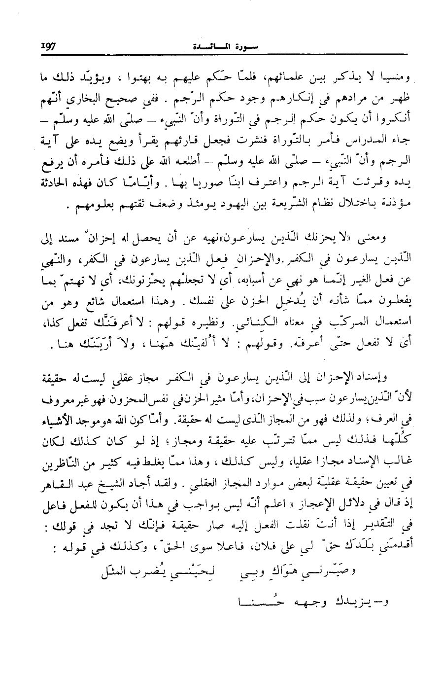 وَمَنْسِيًّا لَا يُذْكَرُ بَيْنَ عُلَمَائِهِمْ، فَلَمَّا حَكَمَ عَلَيْهِمْ بِهِ بُهِتُوا، وَيُؤَيِّدُ ذَلِكَ مَا ظَهَرَ مِنْ مُرَادِهِمْ فِي إِنْكَارِهِمْ وُجُودَ حُكْمِ الرَّجْمِ. فَفِي «صَحِيحِ الْبُخَارِيِّ» أَنَّهُمْ أَنْكَرُوا أَنْ يَكُونَ حُكْمُ الرَّجْمِ فِي التَّوْرَاةِ وأنّ النّبيء صَلَّى اللهُ عَلَيْهِ وَسَلَّمَ جَاءَ الْمدَارِس فَأَمَرَ بِالتَّوْرَاةِ فَنُشِرَتْ فَجَعَلَ قَارِئُهُمْ يَقْرَأُ وَيَضَعُ يَدَهُ عَلَى آيَةِ الرَّجْمِ وأنّ النّبيء صَلَّى اللهُ عَلَيْهِ وَسَلَّمَ أَطْلَعَهُ اللَّهُ عَلَى ذَلِكَ فَأَمَرَهُ أَنْ يَرْفَعَ يَدَهُ وَقُرِئَتْ آيَةُ الرَّجْمِ وَاعْتَرَفَ ابْنَا صُورِيَّا بِهَا. وَأَيًّا مَا كَانَ فَهَذِهِ الْحَادِثَةُ مُؤْذِنَةٌ بِاخْتِلَالِ نِظَامِ الشَّرِيعَةِ بَيْنَ الْيَهُودِ يَوْمَئِذٍ وَضَعْفِ ثِقَتِهِمْ بِعُلُومِهِمْ.