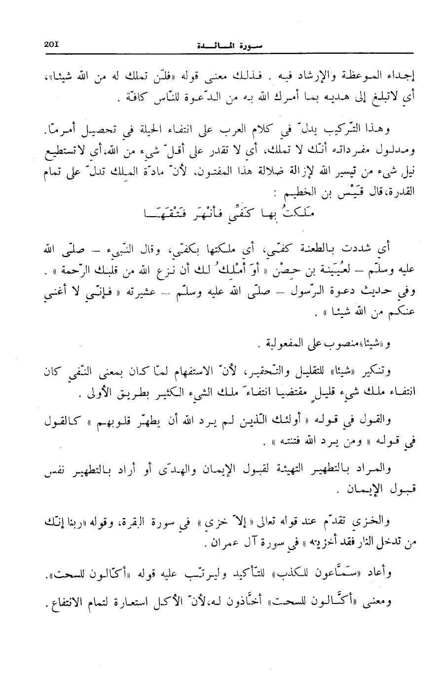وَهَذَا التَّرْكِيبُ يدلّ على كَلَامِ الْعَرَبِ عَلَى انْتِفَاءِ الْحِيلَةِ فِي تَحْصِيلِ أَمْرٍ مَا. وَمَدْلُولُ مُفْرَدَاتِهِ أَنَّكَ لَا تَمْلِكُ، أَيْ لَا تَقْدِرُ عَلَى أَقَلِّ شَيْءٍ مِنَ اللَّهِ، أَيْ لَا تَسْتَطِيعُ نَيْلَ شَيْءٍ مِنْ تَيْسِيرِ اللَّهِ لِإِزَالَةِ ضَلَالَةِ هَذَا الْمَفْتُونِ، لِأَنَّ مَادَّةَ الْمِلْكِ تَدُلُّ عَلَى تَمَامِ الْقُدْرَةِ، قَالَ قَيْسُ بْنُ الْخَطِيمِ: