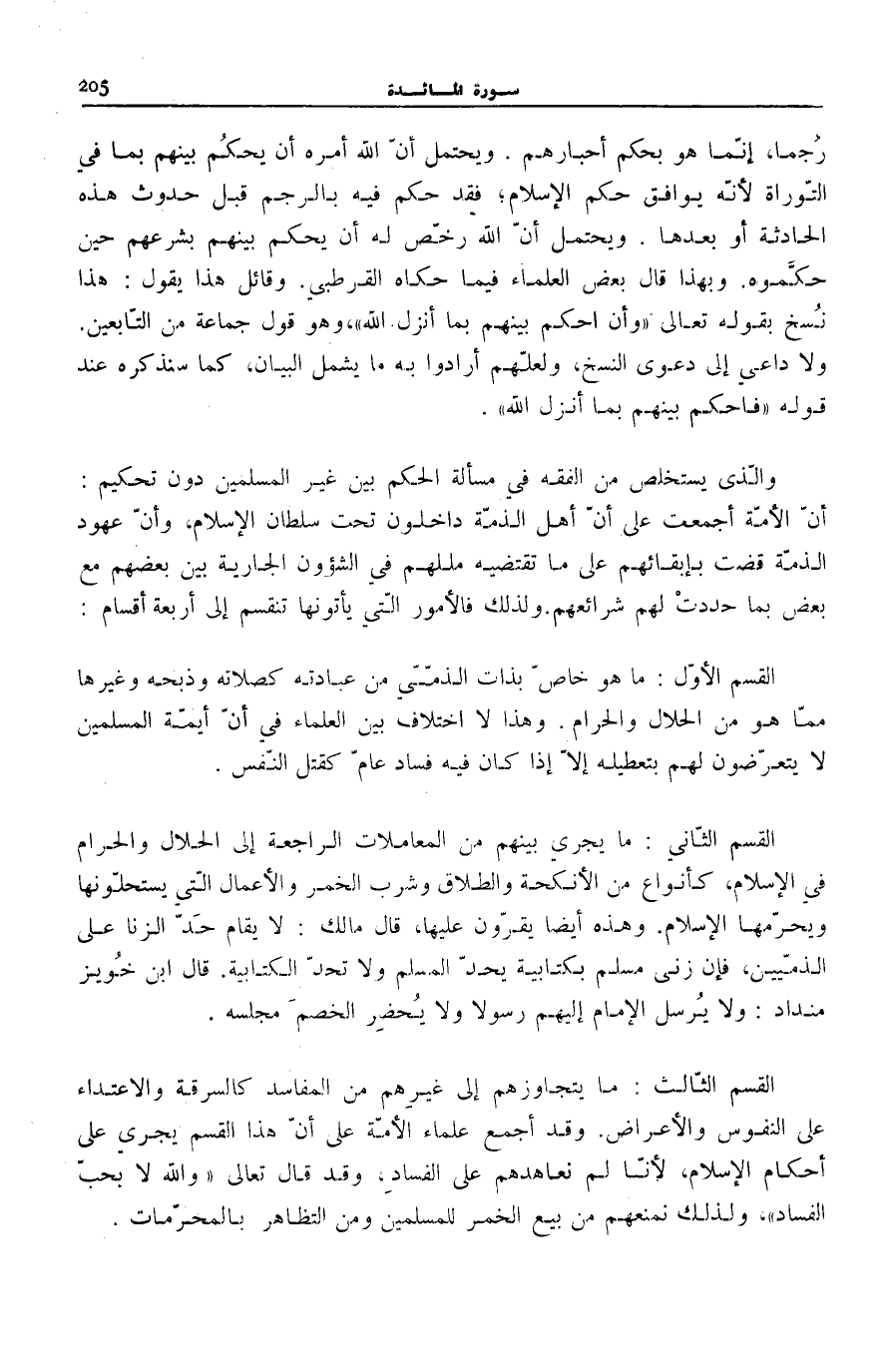 وَالَّذِي يُسْتَخْلَصُ مِنَ الْفِقْهِ فِي مَسْأَلَةِ الْحُكْمِ بَيْنَ غَيْرِ الْمُسْلِمِينَ دُونَ تَحْكِيمٍ: أَنَّ الْأُمَّةَ أَجْمَعَتْ عَلَى أَنَّ أَهْلَ الذِّمَّةِ دَاخِلُونَ تَحْتَ سُلْطَانِ الْإِسْلَامِ، وَأَنَّ عُهُودَ الذِّمَّةِ قَضَتْ بِإِبْقَائِهِمْ عَلَى مَا تَقْتَضِيهِ مللهم فِي الشؤون الْجَارِيَةِ بَيْنَ بَعْضِهِمْ مَعَ بَعْضٍ بِمَا حَدَّدَتْ لَهُمْ شَرَائِعُهُمْ. وَلِذَلِكَ فَالْأُمُورُ الَّتِي يَأْتُونَهَا تَنْقَسِمُ إِلَى أَرْبَعَةِ أَقْسَامٍ: