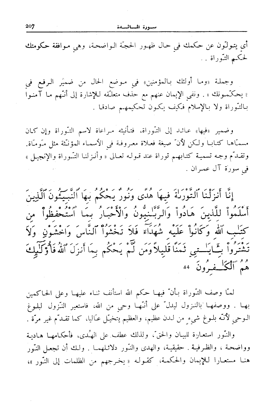 إِنَّا أَنْزَلْنَا التَّوْراةَ فِيها هُدىً وَنُورٌ يَحْكُمُ بِهَا النَّبِيُّونَ الَّذِينَ أَسْلَمُوا لِلَّذِينَ هادُوا وَالرَّبَّانِيُّونَ وَالْأَحْبارُ بِمَا اسْتُحْفِظُوا مِنْ كِتابِ اللَّهِ وَكانُوا عَلَيْهِ شُهَداءَ فَلا تَخْشَوُا النَّاسَ وَاخْشَوْنِ وَلا تَشْتَرُوا بِآياتِي ثَمَناً قَلِيلاً وَمَنْ لَمْ يَحْكُمْ بِما أَنْزَلَ اللَّهُ فَأُولئِكَ هُمُ الْكافِرُونَ (44)