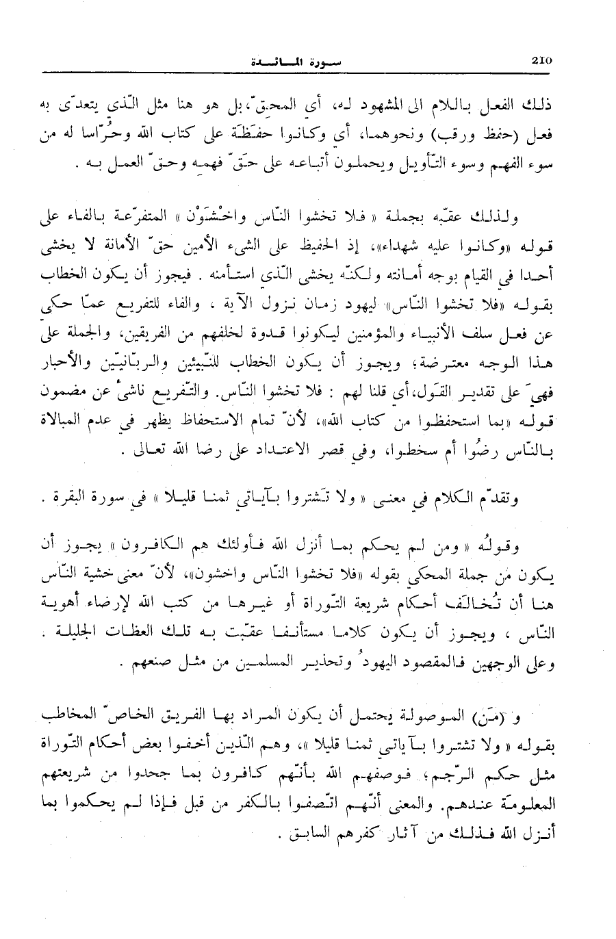 وَقَوْلُهُ وَمَنْ لَمْ يَحْكُمْ بِما أَنْزَلَ اللَّهُ فَأُولئِكَ هُمُ الْكافِرُونَ يَجُوزُ أَنْ يَكُونَ مِنْ جُمْلَةِ الْمَحْكِيِّ بِقَوْلِهِ: فَلا تَخْشَوُا النَّاسَ وَاخْشَوْنِ، لِأَنَّ مَعْنَى خَشْيَةِ النَّاسِ هُنَا أَنْ تُخَالَفَ أَحْكَامُ شَرِيعَةِ التَّوْرَاةِ أَوْ غَيْرِهَا مَنْ كُتُبِ اللَّهِ لِإِرْضَاءِ أَهْوِيَةِ النَّاسِ، وَيَجُوزُ أَنْ يَكُونَ كَلَامًا مُسْتَأْنَفًا عُقِّبَتْ بِهِ تِلْكَ الْعِظَاتُ الْجَلِيلَةُ. وَعَلَى الْوَجْهَيْنِ فَالْمَقْصُودُ الْيَهُودُ وَتَحْذِيرُ الْمُسْلِمِينَ مِنْ مِثْلِ صُنْعِهِمْ.