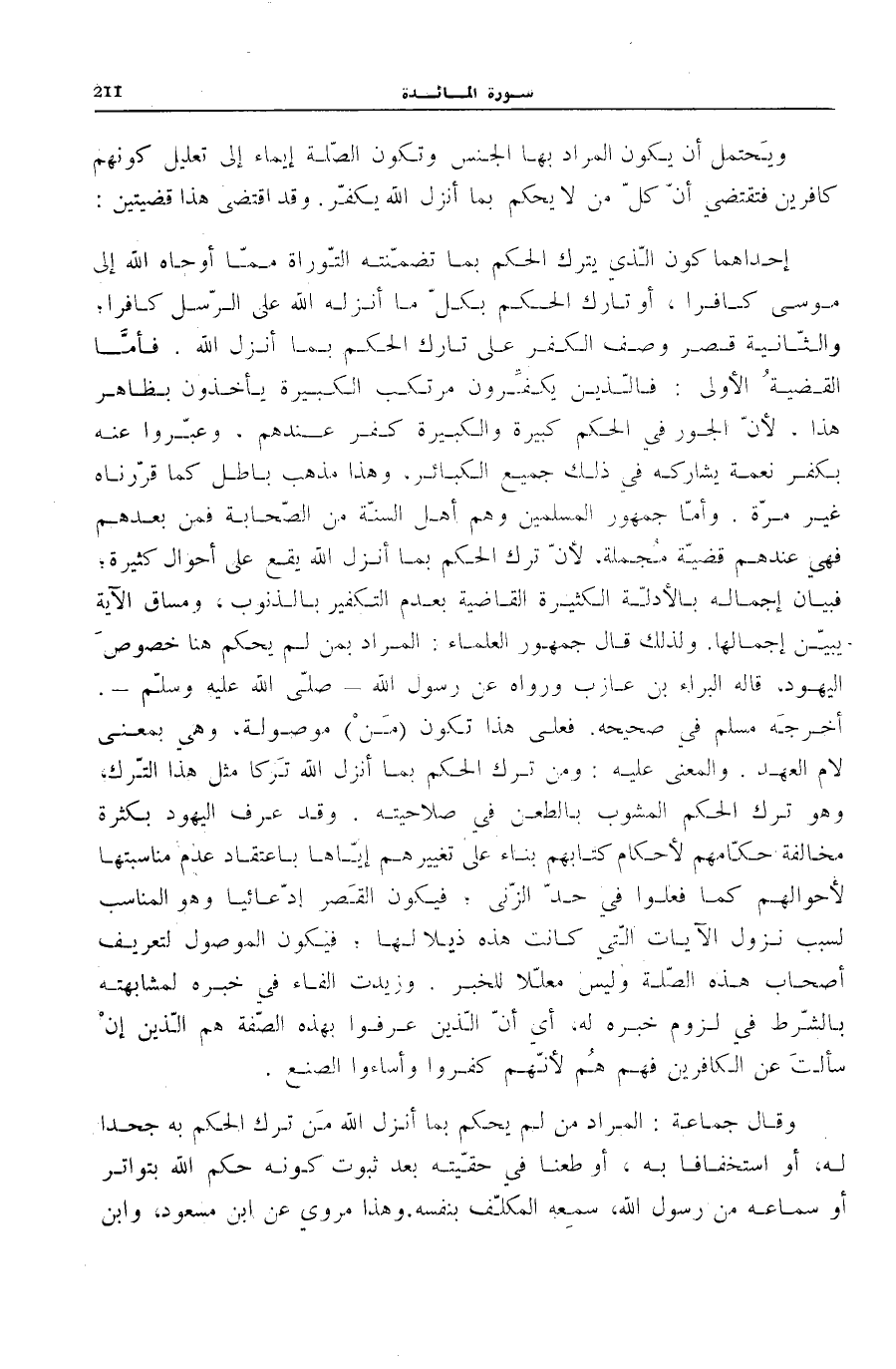 فَأَمَّا الْقَضِيَّةُ الْأُولَى: فَالَّذِينَ يُكَفِّرُونَ مُرْتَكِبَ الْكَبِيرَةِ يَأْخُذُونَ بِظَاهِرِ هَذَا. لِأَنَّ الْجَوْرَ فِي الْحُكْمِ كَبِيرَةٌ وَالْكَبِيرَةُ كُفْرٌ عِنْدَهُمْ. وَعَبَّرُوا عَنْهُ بِكُفْرِ نِعْمَةٍ يُشَارِكُهُ فِي ذَلِكَ جَمِيعُ الْكَبَائِرِ، وَهَذَا مَذْهَبٌ بَاطِلٌ كَمَا قَرَّرْنَاهُ غَيْرَ مَرَّةٍ. وَأَمَّا جُمْهُورُ الْمُسْلِمِينَ وَهُمْ أَهْلُ السُّنَّةِ مِنَ الصَّحَابَةِ فَمَنْ بَعْدَهُمْ فَهِيَ عِنْدَهُمْ قَضِيَّةٌ مُجْمَلَةٌ، لِأَنَّ تَرْكَ الْحُكْمِ بِمَا أَنْزَلَ اللَّهُ يَقَعُ عَلَى أَحْوَالٍ كَثِيرَةٍ فَبَيَانُ إِجْمَالِهِ بِالْأَدِلَّةِ الْكَثِيرَةِ الْقَاضِيَةِ بِعَدَمِ التَّكْفِيرِ بِالذُّنُوبِ، وَمَسَاقُ الْآيَةِ يُبَيِّنُ إِجْمَالَهَا. وَلِذَلِكَ قَالَ جُمْهُورُ الْعُلَمَاءِ: الْمُرَادُ بِمَنْ لَمْ يَحْكُمْ هُنَا خُصُوصُ الْيَهُودِ، قَالَهُ الْبَرَاءُ بْنُ عَازِبٍ وَرَوَاهُ عَنْ رَسُول الله صَلَّى اللهُ عَلَيْهِ وَسَلَّمَ. أَخْرَجَهُ مُسْلِمٌ فِي «صَحِيحِهِ» . فَعَلَى هَذَا تَكُونُ (مَنْ) مَوْصُولَةً، وَهِيَ بِمَعْنَى لَامِ الْعَهْدِ. وَالْمَعْنَى عَلَيْهِ: وَمَنْ تَرَكَ الْحُكْمَ بِمَا أَنْزَلَ اللَّهُ تَرْكًا