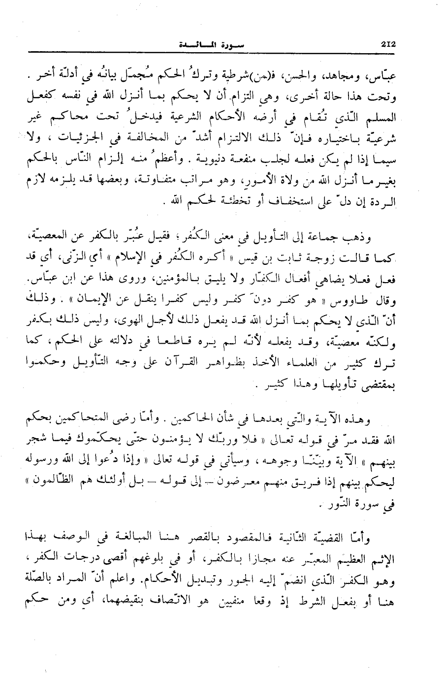 عَبَّاسٍ، وَمُجاهد، وَالْحسن، فَمن شَرْطِيَّةٌ وَتَرْكُ الْحُكْمِ مُجْمَلٌ بَيَانُهُ فِي أَدِلَّةٍ أُخَرَ. وَتَحْتَ هَذَا حَالَةٌ أُخْرَى، وَهِيَ الْتِزَامُ أَنْ لَا يَحْكُمَ بِمَا أَنْزَلَ اللَّهُ فِي نَفْسِهِ كَفِعْلِ الْمُسْلِمِ الَّذِي تُقَامُ فِي أَرْضِهِ الْأَحْكَامُ الشَّرْعِيَّةُ فَيَدْخُلُ تَحْتَ مَحَاكِمَ غَيْرِ شَرْعِيَّةٍ بِاخْتِيَارِهِ فَإِنَّ ذَلِكَ الِالْتِزَامَ أَشَدُّ مِنَ الْمُخَالَفَةِ فِي الْجُزْئِيَّاتِ، وَلَا سِيَّمَا إِذَا لَمْ يَكُنْ فِعْلُهُ لِجَلْبِ مَنْفَعَةٍ دُنْيَوِيَّةٍ. وَأَعْظَمُ مِنْهُ إِلْزَامُ النَّاسِ بِالْحُكْمِ بِغَيْرِ مَا أَنْزَلَ اللَّهُ مِنْ وُلَاةِ الْأُمُورِ، وَهُوَ مَرَاتِبُ مُتَفَاوِتَةٌ، وَبَعْضُهَا قَدْ يَلْزَمُهُ لَازِمُ الرِّدَّةِ إِنْ دَلَّ عَلَى اسْتِخْفَافٍ أَوْ تَخْطِئَةٍ لِحُكْمِ اللَّهِ.