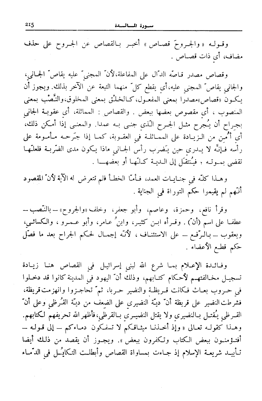 وَقَوْلُهُ: وَالْجُرُوحَ قِصاصٌ أَخْبَرَ بِالْقِصَاصِ عَنِ الْجُرُوحِ عَلَى حَذْفٍ مُضَافٍ، أَيْ ذَاتُ قِصَاصٍ. وقصاص مَصْدَرُ قَاصَّهُ الدَّالُّ عَلَى الْمُفَاعَلَةِ، لِأَنَّ الْمَجْنِيَّ عَلَيْهِ يُقَاصُّ الْجَانِيَ، وَالْجَانِيَ يُقَاصُّ الْمَجْنِيَّ عَلَيْهِ، أَيْ يَقْطَعُ كُلٌّ مِنْهُمَا التَّبِعَةَ عَنِ الْآخَرِ بِذَلِكَ. وَيَجُوزُ أَنْ يَكُونَ قِصاصٌ مَصْدَرًا بِمَعْنَى الْمَفْعُولِ، كَالْخَلْقِ بِمَعْنَى الْمَخْلُوقِ، وَالنَّصْبُ بِمَعْنَى الْمَنْصُوبِ، أَيْ مَقْصُوصٌ بَعْضُهَا بِبَعْضٍ. وَالْقِصَاصُ: الْمُمَاثَلَةُ، أَيْ عُقُوبَةُ الْجَانِي بِجِرَاحٍ أَنْ يُجْرَحَ مِثْلَ الْجُرْحِ الَّذِي جَنَى بِهِ عَمْدًا. وَالْمَعْنَى إِذَا أَمْكَنَ ذَلِكَ، أَيْ أُمِنَ مِنَ الزِّيَادَةِ