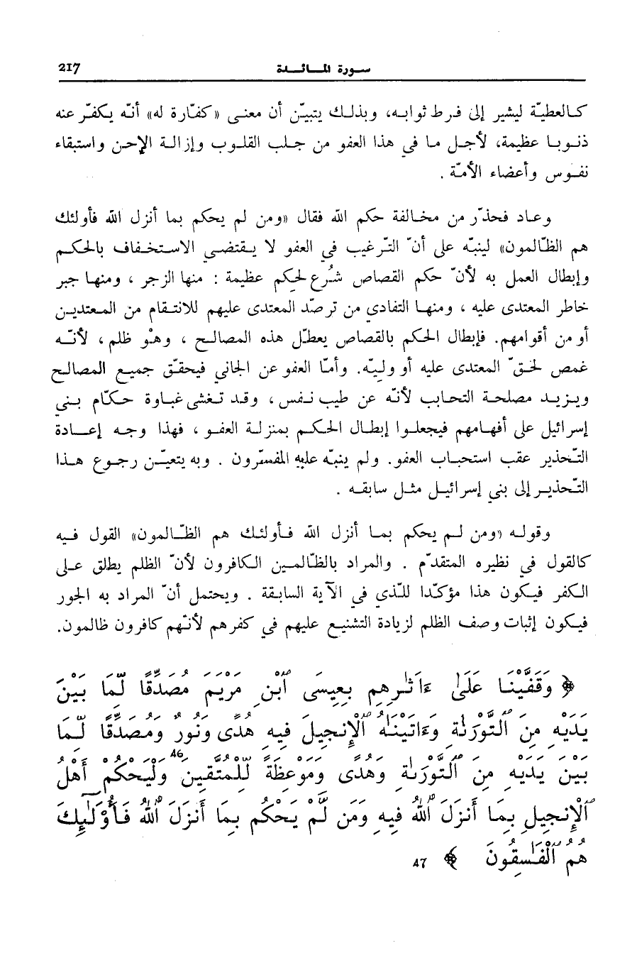 وَقَفَّيْنا عَلى آثارِهِمْ بِعِيسَى ابْنِ مَرْيَمَ مُصَدِّقاً لِما بَيْنَ يَدَيْهِ مِنَ التَّوْراةِ وَآتَيْناهُ الْإِنْجِيلَ فِيهِ هُدىً وَنُورٌ وَمُصَدِّقاً لِما بَيْنَ يَدَيْهِ مِنَ التَّوْراةِ وَهُدىً وَمَوْعِظَةً لِلْمُتَّقِينَ (46) وَلْيَحْكُمْ أَهْلُ الْإِنْجِيلِ بِما أَنْزَلَ اللَّهُ فِيهِ وَمَنْ لَمْ يَحْكُمْ بِما أَنْزَلَ اللَّهُ فَأُولئِكَ هُمُ الْفاسِقُونَ (47)