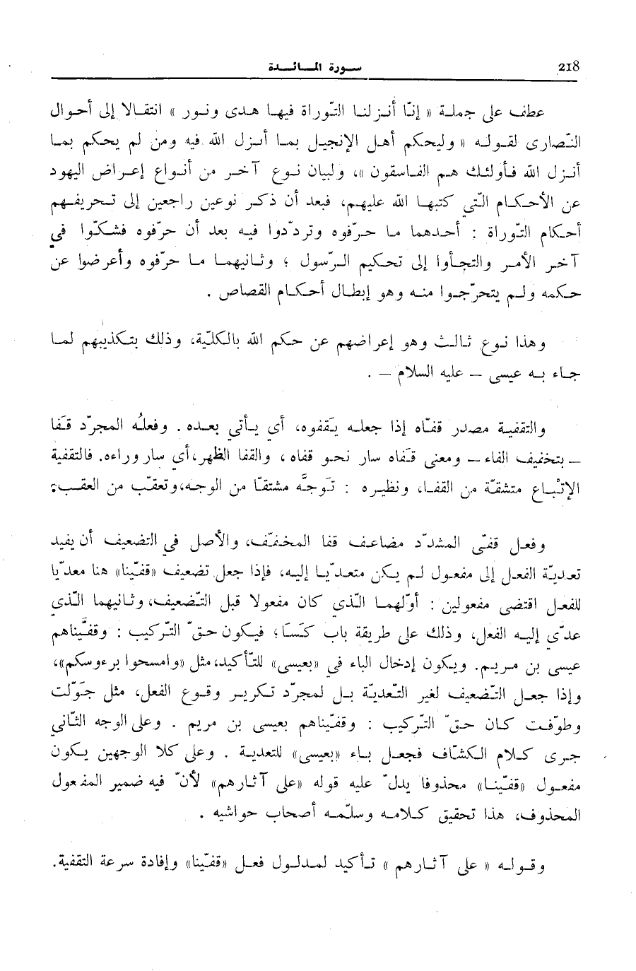 وَالتَّقْفِيَةُ مَصْدَرُ قَفَّاهُ إِذَا جَعَلَهُ يَقْفُوهُ، أَيْ يَأْتِي بَعْدَهُ. وَفِعْلُهُ الْمُجَرَّدُ قَفَا- بِتَخْفِيفِ الْفَاءِ- وَمَعْنَى قَفَاهُ سَارَ نَحْوَ قَفَاهُ، وَالْقَفَا الظَّهْرُ، أَيْ سَارَ وَرَاءَهُ. فالتقفية الإتباع متشقّة مِنَ الْقَفَا، وَنَظِيره: توجّه مشتقّا مِنَ الْوَجْهِ، وَتَعَقَّبَ مِنَ الْعقب. وَفعل قفّى الْمُشَدَّدُ مُضَاعَفُ قَفَا الْمُخَفَّفِ، وَالْأَصْلُ فِي التَّضْعِيفِ أَنْ يُفِيدَ تَعْدِيَةَ الْفِعْلِ إِلَى مَفْعُولٍ لَمْ يَكُنْ مُتَعَدِّيًا إِلَيْهِ، فَإِذَا جُعِلَ تَضْعِيفُ قَفَّيْنا هُنَا مُعَدِّيًا لِلْفِعْلِ اقْتَضَى مَفْعُولَيْنِ: أَوَّلُهُمَا: الَّذِي كَانَ مَفْعُولًا قَبْلَ التَّضْعِيفِ، وَثَانِيهِمَا: الَّذِي عُدِّيَ إِلَيْهِ الْفِعْلُ، وَذَلِكَ عَلَى طَرِيقَةِ بَابِ كَسَا فَيَكُونُ حَقُّ التَّرْكِيبِ: وَقَفَّيْنَاهُمْ عِيسَى ابْنَ مَرْيَمَ، وَيَكُونُ إِدْخَالُ الْبَاءِ فِي بِعِيسَى لِلتَّأْكِيدِ، مثل وَامْسَحُوا بِرُؤُسِكُمْ [الْمَائِدَة: 6] ، وَإِذَا جُعِلَ التَّضْعِيفُ لِغَيْرِ التَّعْدِيَةِ بَلْ لِمُجَرَّدِ تَكْرِيرِ وُقُوعِ الْفِعْلِ، مِثْلَ جَوَّلْتُ وَطَوَّفْتُ كَانَ حَقُّ التَّرْكِيبِ: وَقَفَّيْنَاهُمْ بِعِيسَى ابْنِ مَرْيَمَ. وَعَلَى الْوَجْهِ الثَّانِي جَرَى كَلَامُ «الْكَشَّافِ» فَجَعَلَ بَاءَ بِعِيسَى لِلتَّعْدِيَةِ. وَعَلَى كِلَا الْوَجْهَيْنِ يَكُونُ مَفْعُولُ قَفَّيْنا مَحْذُوفًا يَدُلُّ عَلَيْهِ قَوْلُهُ عَلى آثارِهِمْ لِأَنَّ فِيهِ ضَمِيرَ الْمَفْعُولِ الْمَحْذُوفِ، هَذَا تَحْقِيقُ كَلَامِهِ وَسَلَّمَهُ أَصْحَابُ حَوَاشِيهِ.
