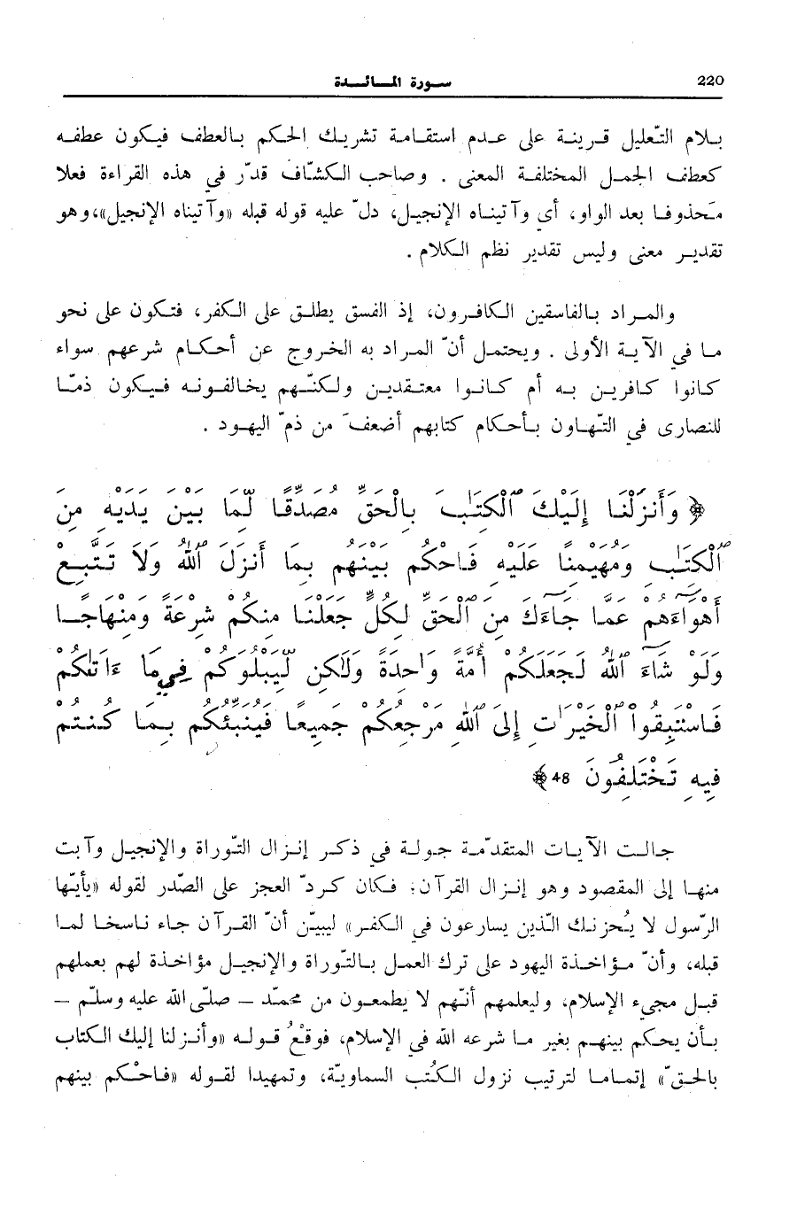 وَأَنْزَلْنا إِلَيْكَ الْكِتابَ بِالْحَقِّ مُصَدِّقاً لِما بَيْنَ يَدَيْهِ مِنَ الْكِتابِ وَمُهَيْمِناً عَلَيْهِ فَاحْكُمْ بَيْنَهُمْ بِما أَنْزَلَ اللَّهُ وَلا تَتَّبِعْ أَهْواءَهُمْ عَمَّا جاءَكَ مِنَ الْحَقِّ لِكُلٍّ جَعَلْنا مِنْكُمْ شِرْعَةً وَمِنْهاجاً وَلَوْ شاءَ اللَّهُ لَجَعَلَكُمْ أُمَّةً واحِدَةً وَلكِنْ لِيَبْلُوَكُمْ فِي مَا آتاكُمْ فَاسْتَبِقُوا الْخَيْراتِ إِلَى اللَّهِ مَرْجِعُكُمْ جَمِيعاً فَيُنَبِّئُكُمْ بِما كُنْتُمْ فِيهِ تَخْتَلِفُونَ (48)