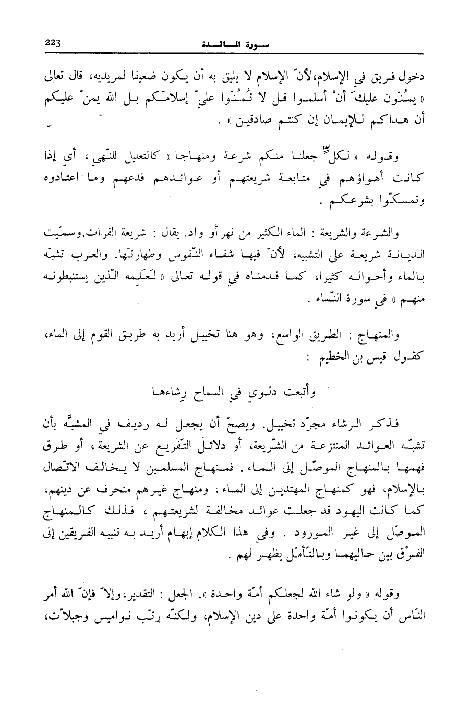 وَأَتْبَعْتُ دَلْوِي فِي السَّمَاحِ رِشَاءَهَا فَذِكْرُ الرِّشَاءِ مُجَرَّدُ تَخْيِيلٍ. وَيَصِحُّ أَنْ يُجْعَلَ لَهُ رَدِيفٌ فِي الْمُشَبَّهِ بِأَنْ تُشَبَّهَ الْعَوَائِدُ الْمُنْتَزَعَةُ مِنَ الشَّرِيعَةِ، أَوْ دَلَائِلُ التَّفْرِيعِ عَنِ الشَّرِيعَةِ، أَوْ طُرُقُ فَهْمِهَا بِالْمِنْهَاجِ الموصّل إِلَى السَّمَاء. فَمِنْهَاجُ الْمُسْلِمِينَ لَا يُخَالِفُ الِاتِّصَالَ بِالْإِسْلَامِ، فَهُوَ كَمِنْهَاجِ الْمُهْتَدِينَ إِلَى الْمَاءِ، وَمِنْهَاجُ غَيْرِهِمْ مُنْحَرِفٌ عَنْ دِينِهِمْ، كَمَا كَانَتِ الْيَهُودُ قَدْ جَعَلَتْ عَوَائِدَ مُخَالِفَةً لِشَرِيعَتِهِمْ، فَذَلِكَ كَالْمِنْهَاجِ الْمُوَصِّلِ إِلَى غَيْرِ الْمَوْرُودِ. وَفِي هَذَا الْكَلَامِ إِبْهَامٌ أُرِيدَ بِهِ تَنْبِيهُ الْفَرِيقَيْنِ إِلَى الْفَرْقِ بَيْنَ حَالَيْهِمَا وَبِالتَّأَمُّلِ يَظْهَرُ لَهُمْ.