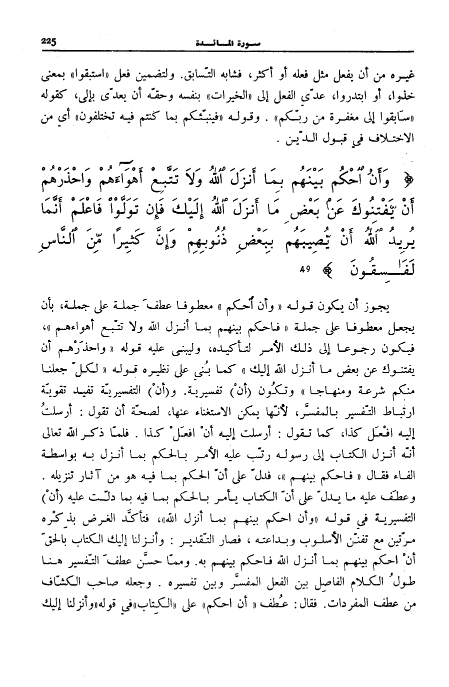 وَتَكُونُ (أَنْ) تَفْسِيرِيَّةً. وَ (أَنْ) التَّفْسِيرِيَّةُ تُفِيدُ تَقْوِيَةَ ارْتِبَاطِ التَّفْسِيرِ بِالْمُفَسَّرِ، لِأَنَّهَا يُمْكِنُ الِاسْتِغْنَاءُ عَنْهَا، لِصِحَّةِ أَنْ تَقُولَ: أَرْسَلْتُ إِلَيْهِ افْعَلْ كَذَا، كَمَا تَقُولُ: أَرْسَلْتُ إِلَيْهِ أَنِ افْعَلْ كَذَا. فَلَمَّا ذَكَرَ اللَّهُ تَعَالَى أَنَّهُ أَنْزَلَ الْكِتَابَ إِلَى رَسُولِهِ رَتَّبَ عَلَيْهِ الْأَمْرَ بِالْحُكْمِ بِمَا أَنْزَلَ بِهِ بِوَاسِطَةِ الْفَاءِ فَقَالَ: فَاحْكُمْ بَيْنَهُمْ [الْمَائِدَة: 48] ، فَدَلَّ عَلَى أَنَّ الْحُكْمَ بِمَا فِيهِ هُوَ مِنْ آثَارِ تَنْزِيلِهِ. وَعَطَفَ عَلَيْهِ مَا يَدُلُّ عَلَى أَنَّ الْكِتَابَ يَأْمُرُ بِالْحُكْمِ بِمَا فِيهِ بِمَا دَلَّتْ عَلَيْهِ (أَنْ) التَّفْسِيرِيَّةُ فِي قَوْلِهِ: وَأَنِ احْكُمْ بَيْنَهُمْ بِما أَنْزَلَ اللَّهُ، فَتَأَكَّدَ الْغَرَضُ بِذِكْرِهِ مَرَّتَيْنِ مَعَ تَفَنُّنِ الْأُسْلُوبِ وَبَدَاعَتِهِ، فَصَارَ التَّقْدِيرُ: وَأَنْزَلْنَا إِلَيْكَ الْكِتَابَ بِالْحَقِّ أَنِ احْكُمْ بَيْنَهُمْ بِمَا أَنْزَلَ اللَّهُ فَاحْكُمْ بَيْنَهُمْ بِهِ. وَمِمَّا حَسَّنَ عَطْفَ التَّفْسِيرِ هُنَا طُولُ الْكَلَامِ الْفَاصِلِ بَيْنَ الْفِعْلِ الْمُفَسِّرِ وَبَيْنَ تَفْسِيرِهِ. وَجَعَلَهُ صَاحِبُ «الْكَشَّافِ» مِنْ عَطْفِ الْمُفْرَدَاتِ. فَقَالَ: عُطِفَ أَنِ احْكُمْ عَلَى الْكِتابَ فِي قَوْلِهِ: وَأَنْزَلْنا إِلَيْكَ
