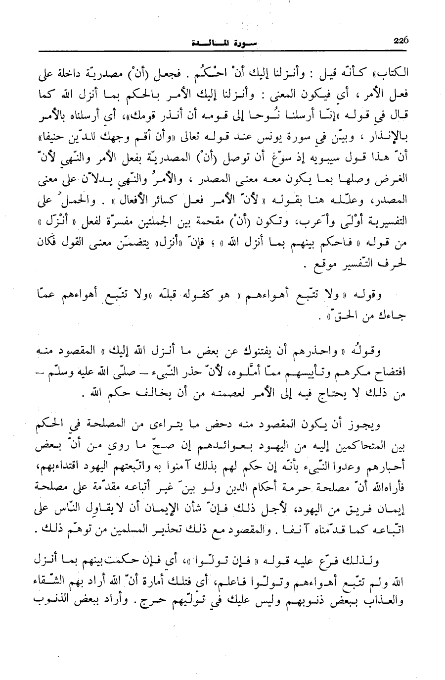 الْكِتابَ [الْمَائِدَة: 48] كَأَنَّهُ قِيلَ: وَأَنْزَلْنَا إِلَيْكَ أَنِ احْكُمْ. فَجَعَلَ (أَنْ) مَصْدَرِيَّةً دَاخِلَةً عَلَى فِعْلِ الْأَمْرِ، أَيْ فَيَكُونُ الْمَعْنَى: وَأَنْزَلْنَا إِلَيْكَ الْأَمْرَ بِالْحُكْمِ بِمَا أَنْزَلَ اللَّهُ كَمَا قَالَ فِي قَوْلِهِ: إِنَّا أَرْسَلْنا نُوحاً إِلى قَوْمِهِ أَنْ أَنْذِرْ قَوْمَكَ [نوح: