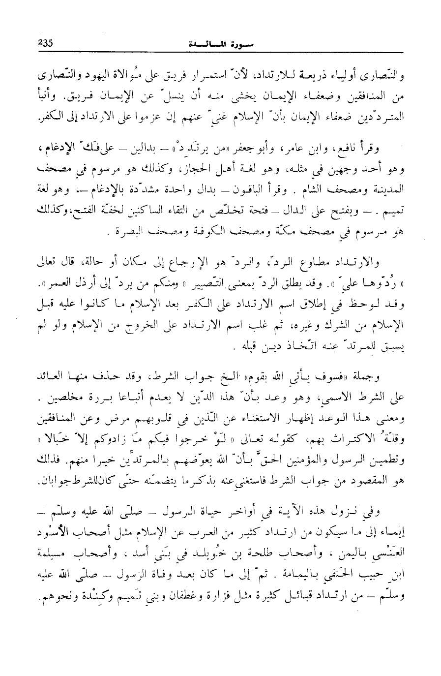 وَقَرَأَ نَافِعٌ، وَابْنُ عَامِرٍ، وَأَبُو جَعْفَرٍ مَنْ يَرْتَدِدْ- بِدَالَيْنِ- عَلَى فَكِّ الْإِدْغَامِ، وَهُوَ أَحَدُ وَجْهَيْنِ فِي مِثْلِهِ، وَهُوَ لُغَةُ أَهْلِ الْحِجَازِ، وَكَذَلِكَ هُوَ مَرْسُومٌ فِي مُصْحَفِ الْمَدِينَةِ وَمُصْحَفِ الشَّامِ. وَقَرَأَ الْبَاقُونَ- بِدَالٍ وَاحِدَةٍ مُشَدَّدَةٍ بِالْإِدْغَامِ-، وَهُوَ لُغَةُ تَمِيمٍ.- وَبِفَتْحٍ عَلَى الدَّالِ- فَتْحَةَ تَخَلُّصٍ مِنِ الْتِقَاءِ السَّاكِنَيْنِ لِخِفَّةِ الْفَتْحِ، وَكَذَلِكَ هُوَ مَرْسُومٌ فِي مُصْحَفِ مَكَّةَ وَمُصْحَفِ الْكُوفَةِ وَمُصْحَفِ الْبَصْرَةِ.