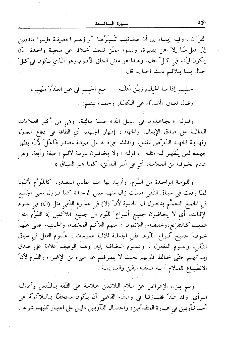 مِنْهُمُ اللَّائِمُ الْمُخِيفُ، وَالْحَبِيبُ فَنَفَى عَنْهُمْ خَوْفَ جَمِيعِ أَنْوَاعِ اللَّوْمِ. فَفِي الْجُمْلَةِ ثَلَاثَةُ عُمُومَاتٍ: عُمُومُ الْفِعْلِ فِي سِيَاقِ النَّفْيِ، وَعُمُومُ الْمَفْعُولِ، وَعُمُومُ الْمُضَافِ إِلَيْهِ. وَهَذَا الْوَصْفُ عَلَامَةٌ عَلَى صِدْقِ إِيمَانِهِمْ حَتَّى خَالَطَ قُلُوبَهُمْ بِحَيْثُ لَا يَصْرِفُهُمْ عَنْهُ شَيْءٌ مِنَ الْإِغْرَاءِ وَاللَّوْمِ لِأَنَّ الِانْصِيَاعَ لِلْمَلَامِ آيَةُ ضَعْفِ الْيَقِينِ وَالْعَزِيمَةِ.
