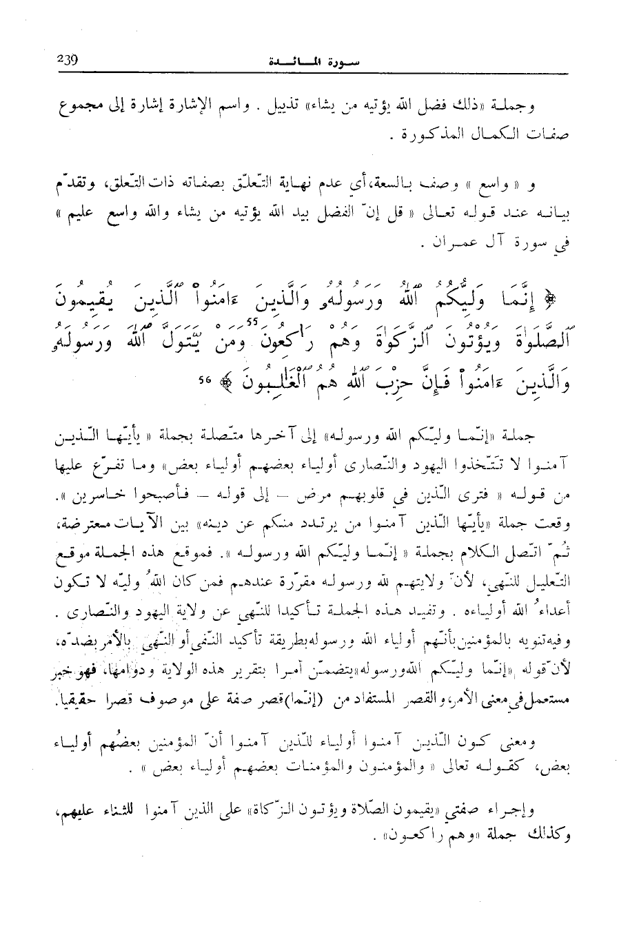 جُمْلَةُ إِنَّما وَلِيُّكُمُ اللَّهُ وَرَسُولُهُ إِلَى آخِرِهَا مُتَّصِلَةٌ بِجُمْلَةِ يَا أَيُّهَا الَّذِينَ آمَنُوا لَا تَتَّخِذُوا الْيَهُودَ وَالنَّصارى أَوْلِياءَ بَعْضُهُمْ أَوْلِياءُ بَعْضٍ [الْمَائِدَة: 51] وَمَا تَفَرَّعَ عَلَيْهَا مِنْ قَوْلِهِ فَتَرَى الَّذِينَ فِي قُلُوبِهِمْ مَرَضٌ- إِلَى قَوْلِهِ- فَأَصْبَحُوا خاسِرِينَ [الْمَائِدَة: 52، 53] . وَقَعَتْ جُمْلَةُ يَا أَيُّهَا الَّذِينَ آمَنُوا مَنْ يَرْتَدَّ مِنْكُمْ عَنْ دِينِهِ [الْمَائِدَة: 54] بَيْنَ الْآيَاتِ مُعْتَرِضَةً، ثُمَّ اتَّصَلَ الْكَلَامُ بِجُمْلَةِ إِنَّما وَلِيُّكُمُ اللَّهُ وَرَسُولُهُ. فَمَوْقِعُ هَذِهِ الْجُمْلَةِ مَوْقِعُ التَّعْلِيلِ لِلنَّهْيِ، لِأَنَّ وَلَايَتَهُمْ لِلَّهِ وَرَسُولِهِ مُقَرَّرَةٌ عِنْدَهُمْ فَمَنْ كَانَ اللَّهُ وَلَيَّهُ لَا تَكُونُ أَعْدَاءُ اللَّهِ أَوْلِيَاءَهُ. وَتُفِيدُ هَذِهِ الْجُمْلَةُ تَأْكِيدًا لِلنَّهْيِ عَنْ وَلَايَةِ الْيَهُودِ وَالنَّصَارَى. وَفِيهِ تَنْوِيهٌ بِالْمُؤْمِنِينَ بِأَنَّهُمْ أَوْلِيَاءُ اللَّهِ وَرَسُولِهِ بِطَرِيقَةِ تَأْكِيدِ النَّفْيِ أَوِ النَّهْيِ بِالْأَمْرِ بِضِدِّهِ، لِأَنَّ قَوْلَهُ: إِنَّما وَلِيُّكُمُ اللَّهُ وَرَسُولُهُ يَتَضَمَّنُ أَمْرًا بِتَقْرِيرِ هَذِهِ الْوَلَايَةِ وَدَوَامِهَا، فَهُوَ خَبَرٌ مُسْتَعْمَلٌ فِي مَعْنَى الْأَمْرِ، وَالْقَصْرُ الْمُسْتَفَادُ مِنْ (إِنَّمَا) قَصْرُ صِفَةٍ عَلَى مَوْصُوفٍ قَصْرًا حَقِيقِيًّا.