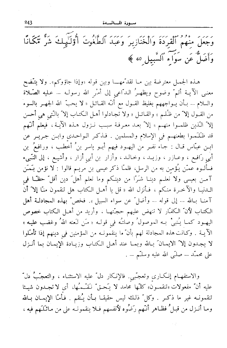 [النِّسَاء: 148] وَالْقَائِلُ وَلا تُجادِلُوا أَهْلَ الْكِتابِ إِلَّا بِالَّتِي هِيَ أَحْسَنُ إِلَّا الَّذِينَ ظَلَمُوا مِنْهُمْ [العنكبوت: 46] إِلَّا بَعْدَ مَعْرِفَةِ سَبَبِ نُزُولِ هَذِهِ الْآيَةِ، فَيُعْلَمُ أَنَّهُمْ قَدْ ظَلَمُوا بِطَعْنِهِمْ فِي الْإِسْلَامِ وَالْمُسْلِمِينَ. فَذَكَرَ الْوَاحِدِيُّ وَابْنُ جَرِيرٍ عَنِ ابْنِ عَبَّاسٍ قَالَ: جَاءَ نَفَرٌ مِنَ الْيَهُودِ فِيهِمْ أَبُو يَاسِرِ بْنُ أَخْطَبَ، وَرَافِعُ بْنُ أَبِي رَافِعٍ، وَعَازِرٌ، وَزَيْدٌ، وَخَالِدٌ، وَأَزَارُ بْنُ أَبِي أَزَارٍ، وَأَشْيَعُ، إِلَى النَّبِيءِ فَسَأَلُوهُ عَمَّنْ يُؤْمِنُ بِهِ مِنَ الرُّسُلِ، فَلَمَّا ذَكَرَ عِيسَى ابْنَ مَرْيَمَ قَالُوا: لَا نُؤْمِنُ بِمَنْ آمَنَ بِعِيسَى وَلَا نَعْلَمُ دِينًا شَرًّا مِنْ دِينِكُمْ وَمَا نَعْلَمُ أَهْلَ دِينٍ أَقَلَّ حَظًّا فِي الدُّنْيَا وَالْآخِرَةِ مِنْكُمْ، فَأَنْزَلَ اللَّهُ قُلْ يَا أَهْلَ الْكِتابِ هَلْ تَنْقِمُونَ مِنَّا إِلَّا أَنْ آمَنَّا بِاللَّهِ- إِلَى قَوْلِهِ- وَأَضَلُّ عَنْ سَواءِ السَّبِيلِ. فَخَصَّ بِهَذِهِ الْمُجَادَلَةِ أَهْلَ الْكِتَابِ لِأَنَّ الْكُفَّارَ لَا تَنْهَضُ عَلَيْهِمْ حُجَّتُهَا، وَأُرِيدَ مِنْ أَهْلِ الْكِتَابِ خُصُوصُ الْيَهُود كَمَا ينبىء بِهِ الْمَوْصُولُ وَصِلَتُهُ فِي قَوْلِهِ: مَنْ لَعَنَهُ اللَّهُ وَغَضِبَ عَلَيْهِ الْآيَةَ. وَكَانَتْ هَذِهِ الْمُجَادَلَةُ لَهُمْ بِأَنَّ مَا يَنْقِمُونَهُ مِنَ الْمُؤْمِنِينَ فِي دِينِهِمْ إِذَا تَأَمَّلُوا لَا يَجِدُونَ إِلَّا الْإِيمَانَ بِاللَّهِ وَبِمَا عِنْدَ أَهْلِ الْكِتَابِ وَزِيَادَةُ الْإِيمَانِ بِمَا أُنْزِلَ على محمّد صَلَّى اللهُ عَلَيْهِ وَسَلَّمَ.