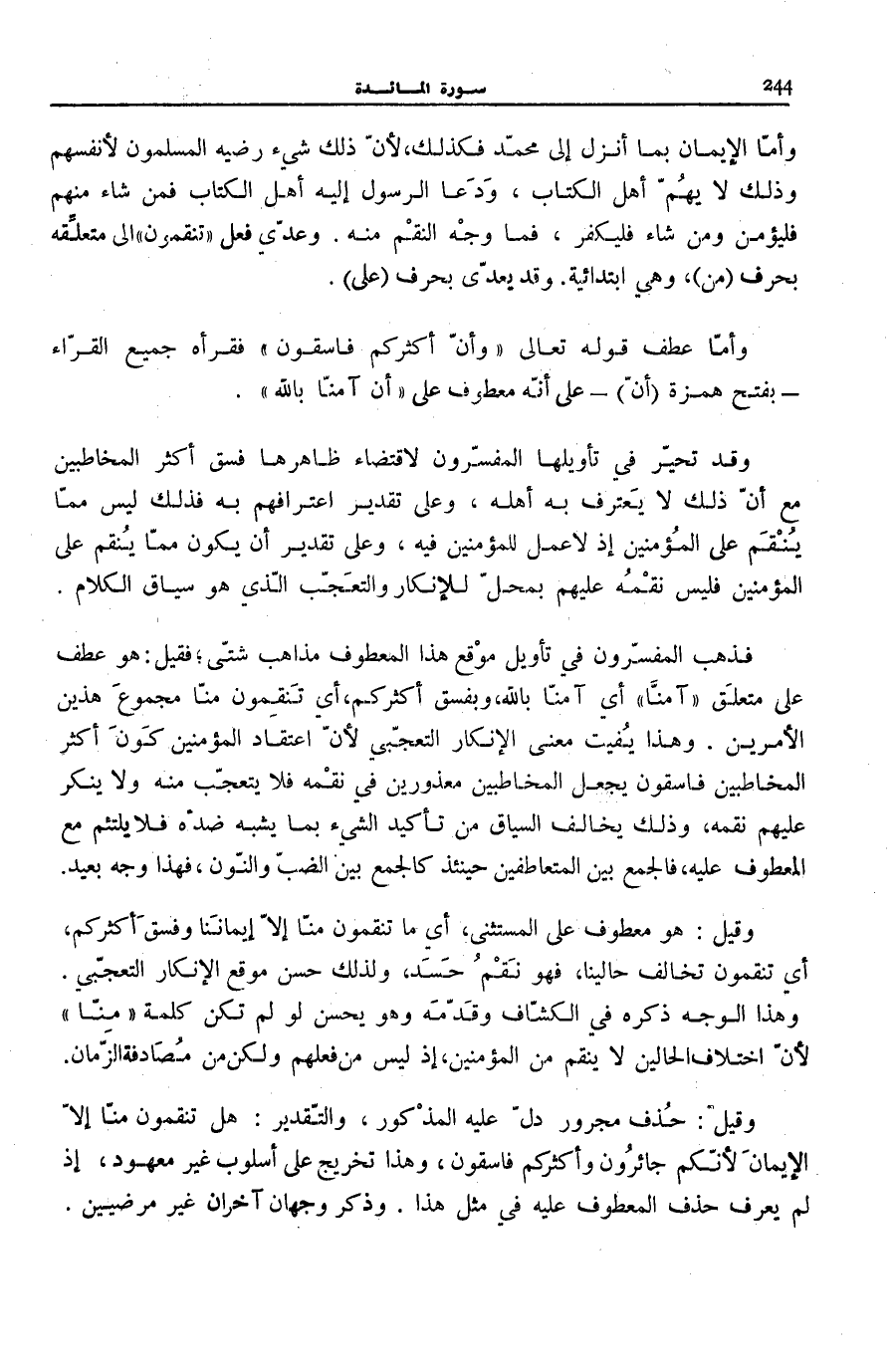 فَذَهَبَ الْمُفَسِّرُونَ فِي تَأْوِيلِ مَوْقِعِ هَذَا الْمَعْطُوفِ مَذَاهِبَ شَتَّى فَقِيلَ: هُوَ عَطْفٌ عَلَى مُتَعَلِّقِ آمَنَّا أَيْ آمَنَّا بِاللَّهِ، وَبِفِسْقِ أَكْثَرِكُمْ، أَيْ تَنْقِمُونَ مِنَّا مَجْمُوعَ هَذَيْنِ الْأَمْرَيْنِ. وَهَذَا
