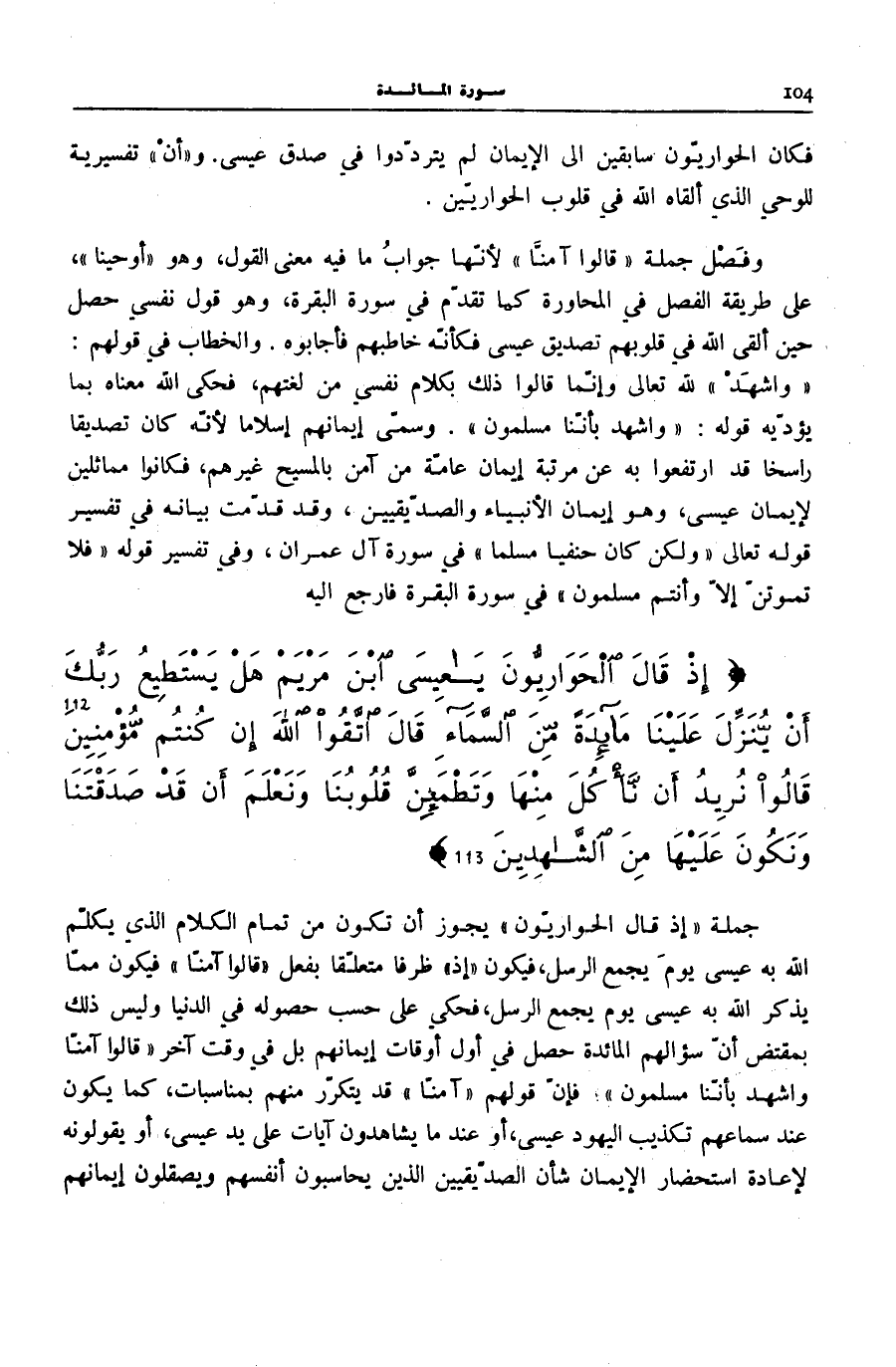 إِذْ قالَ الْحَوارِيُّونَ يَا عِيسَى ابْنَ مَرْيَمَ هَلْ يَسْتَطِيعُ رَبُّكَ أَنْ يُنَزِّلَ عَلَيْنا مائِدَةً مِنَ السَّماءِ قالَ اتَّقُوا اللَّهَ إِنْ كُنْتُمْ مُؤْمِنِينَ (112) قالُوا نُرِيدُ أَنْ نَأْكُلَ مِنْها وَتَطْمَئِنَّ قُلُوبُنا وَنَعْلَمَ أَنْ قَدْ صَدَقْتَنا وَنَكُونَ عَلَيْها مِنَ الشَّاهِدِينَ (113)