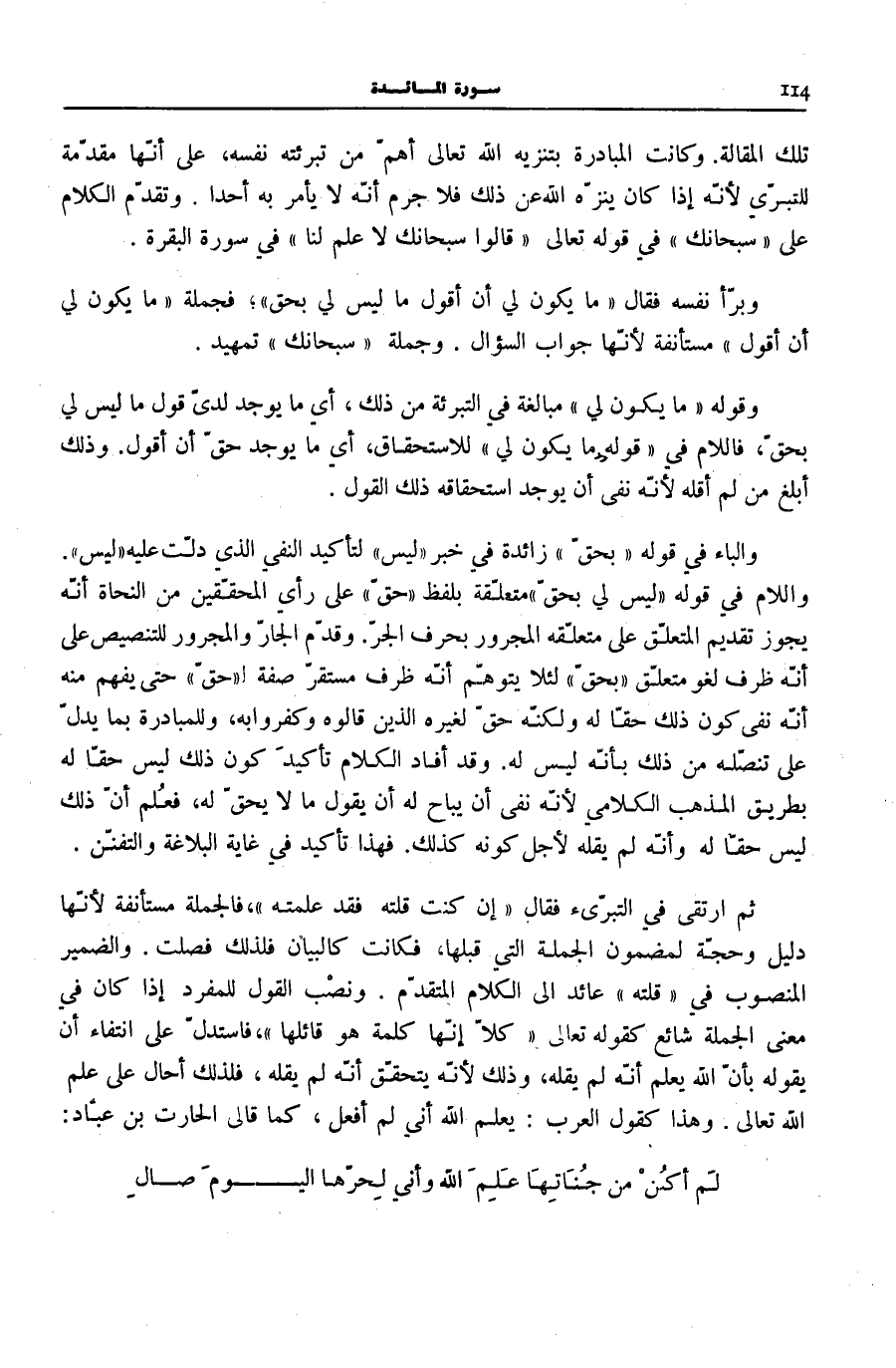 وَالْبَاءُ فِي قَوْلِهِ بِحَقٍّ زَائِدَةٌ فِي خَبَرِ لَيْسَ لِتَأْكِيدِ النَّفْيِ الَّذِي دَلَّتْ عَلَيْهِ لَيْسَ. وَاللَّامُ فِي قَوْلِهِ لَيْسَ لِي بِحَقٍّ متعلّقة بِلَفْظ بِحَقٍّ عَلَى رَأْيِ الْمُحَقِّقِينَ مِنَ النُّحَاةِ أَنَّهُ يَجُوزُ تَقْدِيمُ الْمُتَعَلِّقِ عَلَى مُتَعَلَّقِهِ الْمَجْرُورِ بِحَرْفِ الْجَرِّ. وَقُدِّمَ الْجَارُّ وَالْمَجْرُورُ لِلتَّنْصِيصِ عَلَى أَنَّهُ ظَرْفُ لَغْو متعلّق بِحَقٍّ لِئَلَّا يُتَوَهَّمَ أَنَّهُ ظَرْفٌ مستقرّ صفة لحق حَتَّى يُفْهَمَ مِنْهُ أَنَّهُ نَفَى كَوْنَ ذَلِكَ حَقًّا لَهُ وَلَكِنَّهُ حَقٌّ لِغَيْرِهِ الَّذِينَ قَالُوهُ وَكَفَرُوا بِهِ، وَلِلْمُبَادَرَةِ بِمَا يَدُلُّ عَلَى تَنَصُّلِهِ مِنْ ذَلِكَ بِأَنَّهُ لَيْسَ لَهُ. وَقَدْ أَفَادَ الْكَلَامُ تَأْكِيدَ كَوْنِ ذَلِكَ لَيْسَ حَقًّا لَهُ بِطَرِيقِ الْمَذْهَبِ الْكَلَامِيِّ لِأَنَّهُ نَفَى أَنْ يُبَاحَ لَهُ أَنْ يَقُولَ مَا لَا يَحِقُّ لَهُ، فَعَلِمَ أَنَّ ذَلِكَ لَيْسَ حَقًّا لَهُ وَأَنَّهُ لَمْ يَقُلْهُ لِأَجْلِ كَوْنِهِ كَذَلِكَ. فَهَذَا تَأْكِيدٌ فِي غَايَةِ الْبَلَاغَةِ وَالتَّفَنُّنِ.