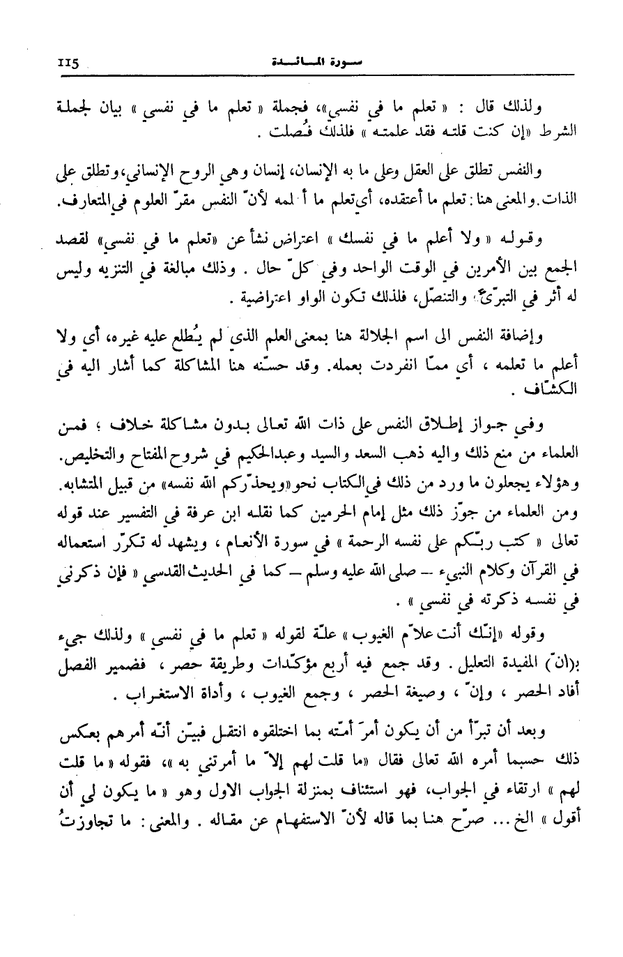 وَإِضَافَةُ النَّفْسِ إِلَى اسْمِ الْجَلَالَةِ هَنَا بِمَعْنَى الْعِلْمِ الَّذِي لَمْ يُطْلِعْ عَلَيْهِ غَيْرَهُ، أَيْ وَلَا أَعْلَمُ مَا تَعْلَمُهُ، أَيْ ممّا انْفَرَدت بِعَمَلِهِ. وَقَدْ حَسَّنَهُ هُنَا الْمُشَاكَلَةُ كَمَا أَشَارَ إِلَيْهِ فِي «الْكَشَّافِ» .