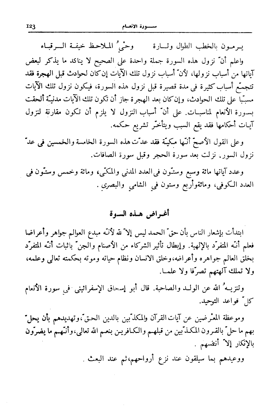 وَاعْلَمْ أَنَّ نُزُولَ هَذِهِ السُّورَةِ جُمْلَةً وَاحِدَةً عَلَى الصَّحِيحِ لَا يُنَاكِدُ مَا يُذْكَرُ لِبَعْضِ آيَاتِهَا مِنْ أَسْبَابِ نُزُولِهَا، لِأَنَّ أَسْبَابَ نُزُولِ تِلْكَ الْآيَاتِ إِنْ كَانَ لِحَوَادِثَ قَبْلَ الْهِجْرَةِ فَقَدْ تَتَجَمَّعُ أَسْبَابٌ كَثِيرَةٌ فِي مُدَّةٍ قَصِيرَةٍ قَبْلَ نُزُولِ هَذِهِ السُّورَةِ، فَيَكُونُ نُزُولُ تِلْكَ الْآيَاتِ مُسَبَّبًا عَلَى تِلْكَ الْحَوَادِثِ، وَإِنْ كَانَ بَعْدَ الْهِجْرَةِ جَازَ أَنْ تَكُونَ تِلْكَ الْآيَاتُ مَدَنِيَّةً أُلْحِقَتْ بِسُورَةِ الْأَنْعَامِ لِمُنَاسَبَاتٍ. عَلَى أَنَّ أَسْبَابَ النُّزُولِ لَا يَلْزَمُ أَنْ تَكُونَ مُقَارِنَةً لِنُزُولِ آيَاتِ أَحْكَامِهَا فَقَدْ يَقَعُ السَّبَبُ وَيَتَأَخَّرُ تَشْرِيعُ حُكْمِهِ.